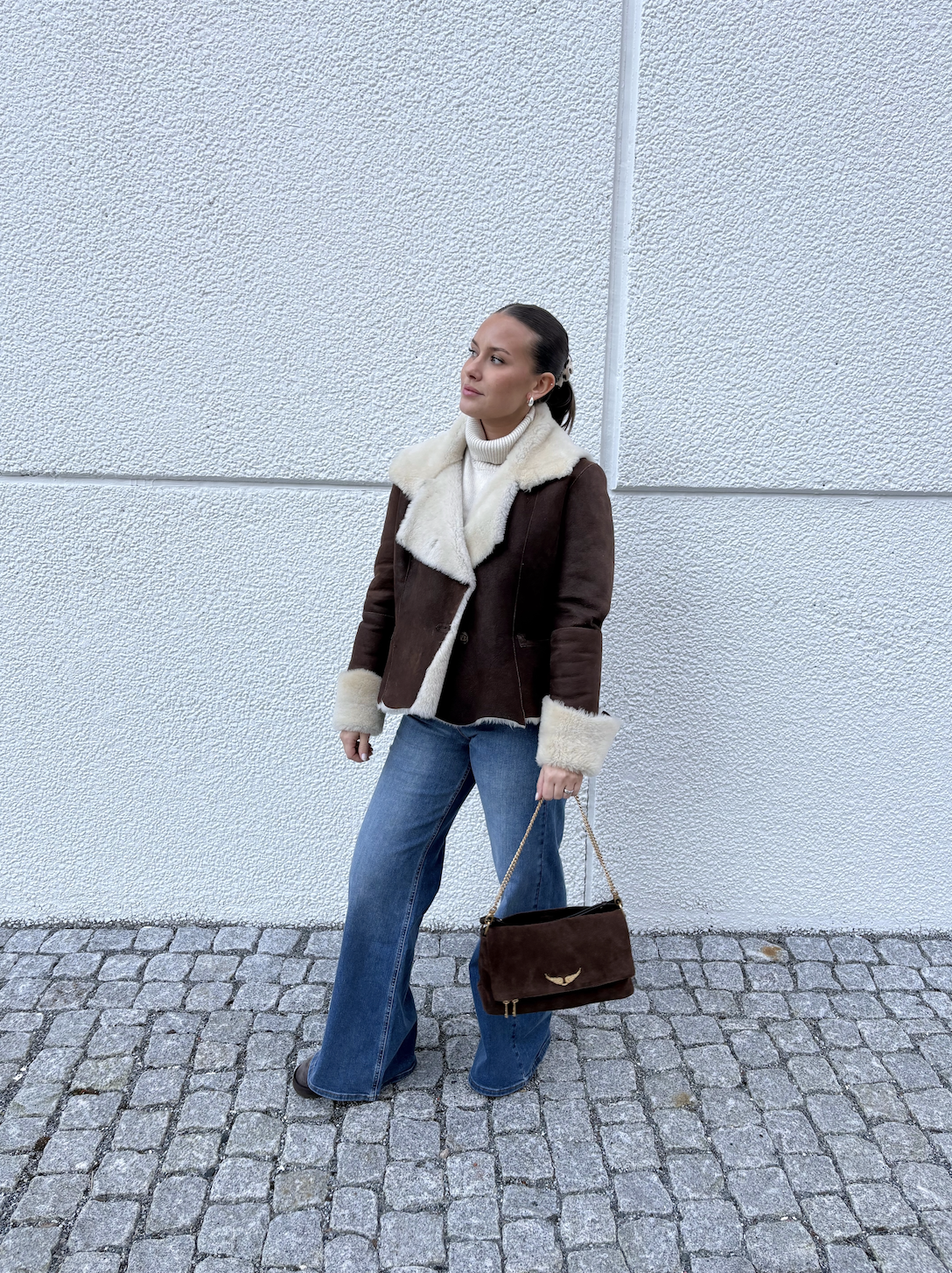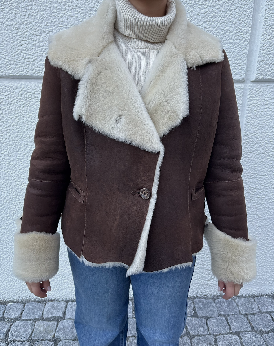 Nydelig saueskinnsjakke fra Møller. Jakken kan vrenges og brukes begge sider. Jakke i trigado lam Beige / Hvit