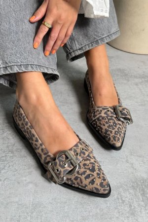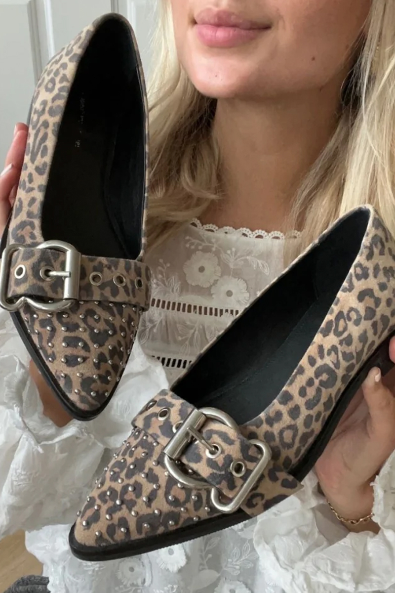 Feminine ballerinasko i semsket skinn med sølvnagler og en lett spiss tå. Skoene har også en dekorativ og justerbar spenne.