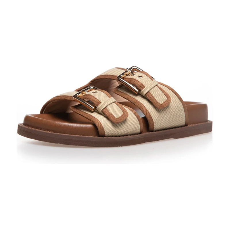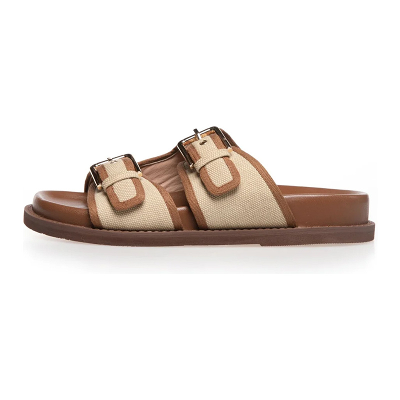 Trendy damesandaler i et avslappet design med brede, beige tekstilstropper og vakre brune kanter. Stroppene er regulerbare med spenner i gullfarget metall.Den myke sålen og den lett polstrede fotsengen sikrer høy komfort – perfekt for sommerdager og avslappet hverdagsbruk.