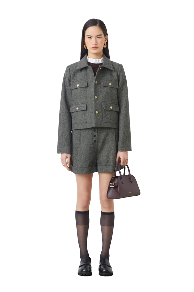 Dexter fra Suncoo er en kort klassisk jakke. Jakken kommer i et herringbone-mønster i en ullblanding. Den har fire frontlommer med klaff og gullknapper. For en komplett look kan den matches med Jazzy Pants som kommer i samme materiale og mønster.