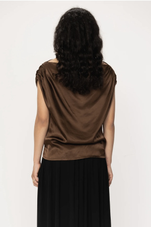 Adhara er en avslappet topp laget i en delikat rayon-viskoseblanding. Toppen har vid hals og rynkede skuldersømmer som skaper myke draperinger. Den kan brukes off-shoulder eller med en klassisk båthals.