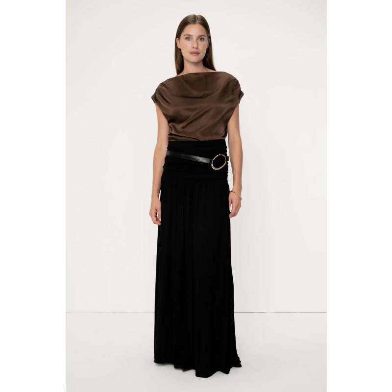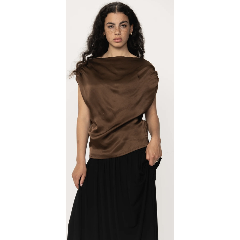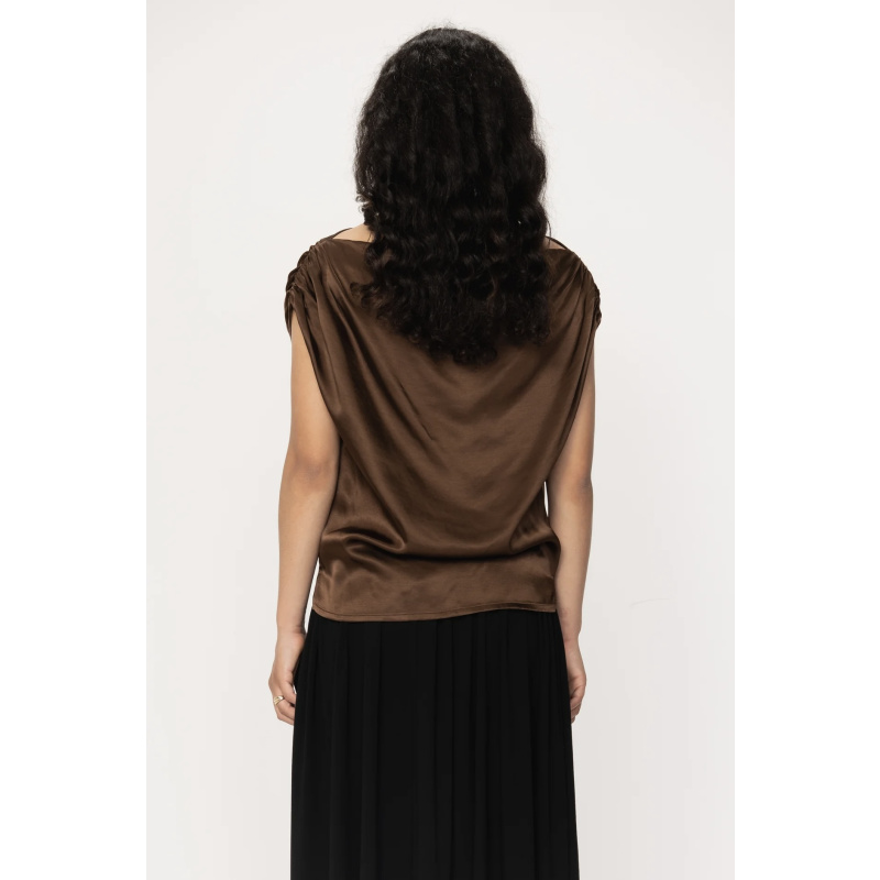 Adhara er en avslappet topp laget i en delikat rayon-viskoseblanding. Toppen har vid hals og rynkede skuldersømmer som skaper myke draperinger. Den kan brukes off-shoulder eller med en klassisk båthals.