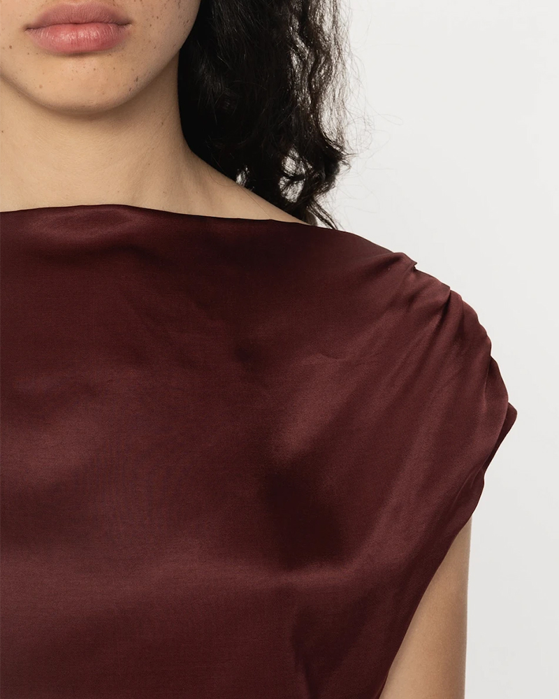 Adhara er en avslappet topp laget i en delikat rayon-viskoseblanding. Toppen har vid hals og rynkede skuldersømmer som skaper myke draperinger. Den kan brukes off-shoulder eller med en klassisk båthals.