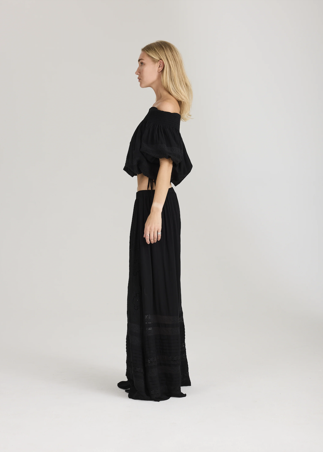 Lita Off-Shoulder Top. Lita Off-Shoulder Top fra Ravn Ravn er en off-shoulder-topp med en avslappet silhuett og et lett, flytende fall. Designet for å enkelt matches med tilhørende Lita Maxi Skirt eller løfte hverdagsantrekk med et elegant uttrykk.