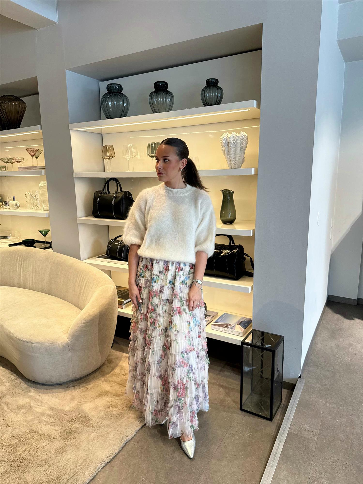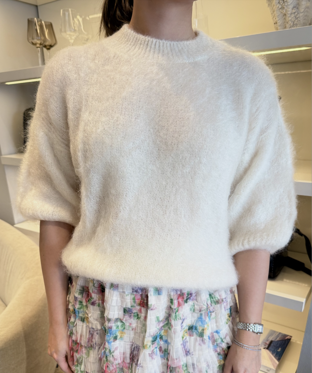 Kortermet t-shirt i mohairblanding fra From Paris With Love. Toppen har kort passform med voluminøse halvlange ermer. Ribbedetaljer i halsen, midjen og rundt ermene. Dette produktet er onesize.