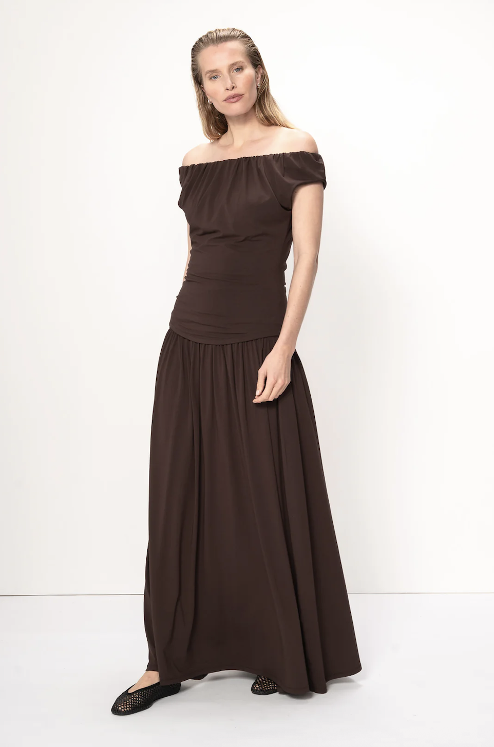 Nia Top fra Viveh er en ermeløs topp med bred, mykt rynket utringning. Utringningen kan bæres rett over skuldrene eller styles asymmetrisk. Designet som et enkelt, elegant plagg til både oppgraderte hverdagsantrekk og kveldsbruk.