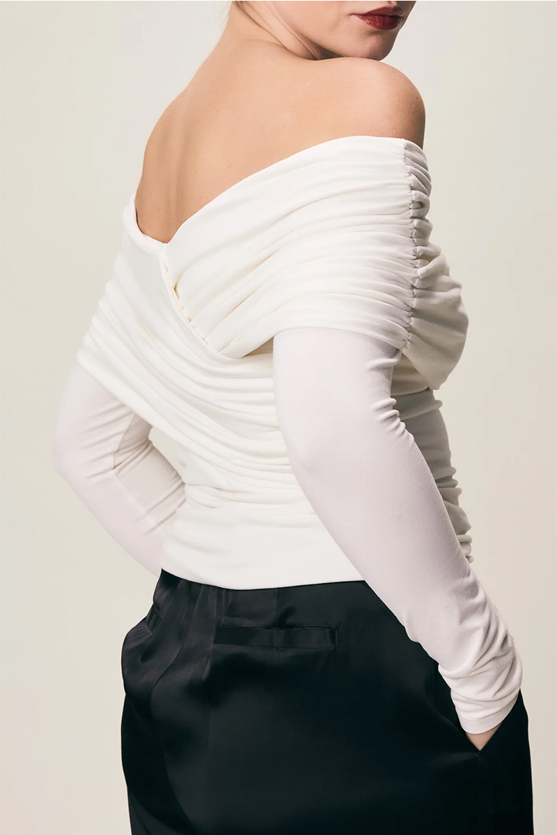 VIVEH Plum er en langermet versjon av vår bestselgende Giada. Det rynkete, off-the-skulder-snittet skaper en vakker omslag over brystet, noe som gjør den til den perfekte kveldstoppen som også kan styles for dagen. Laget av vår signatur ECOVERO™ viskosejersey-stoff, den bæres stramt og klemmer kroppen elegant. Plum kan vendes og gir deg muligheten til to forskjellige utringninger. Kroppen er dobbeltfôret for ekstra støtte.