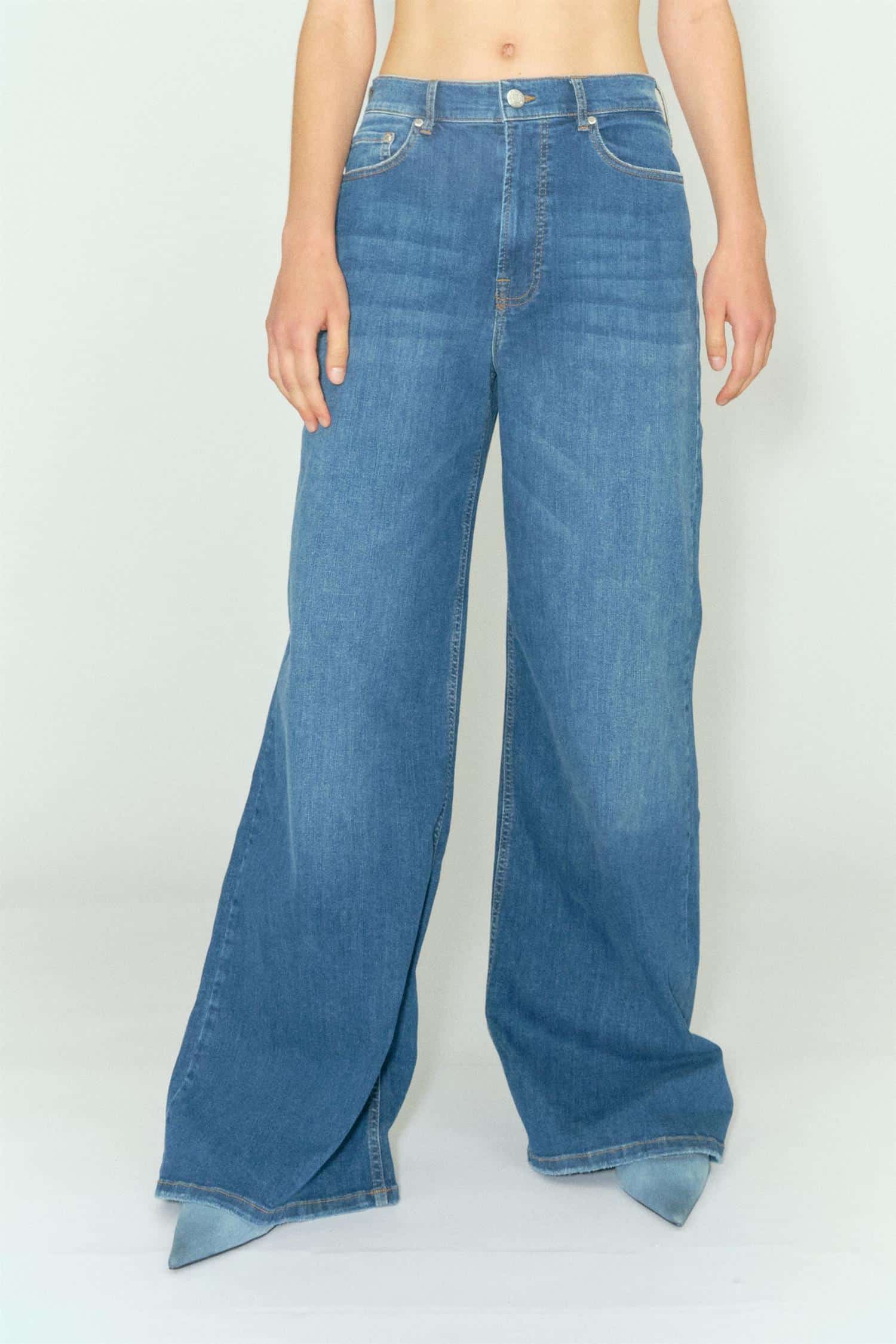 Disse 5-lommers jeansene sitter casual rundt hofter og lår med brede ben. Kvalitet: Økologisk bomull 95,45 % Resirkulert polyester 3,46