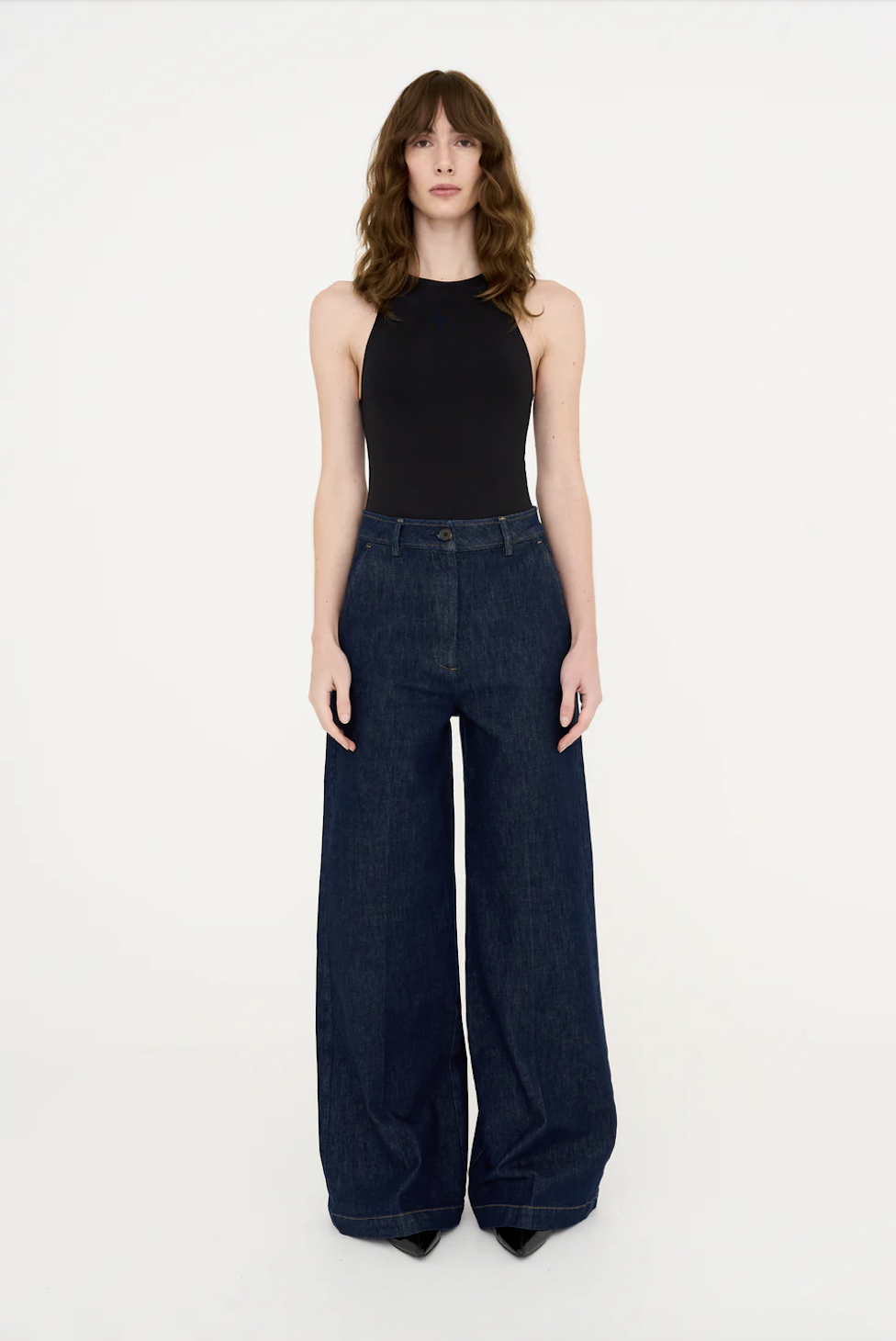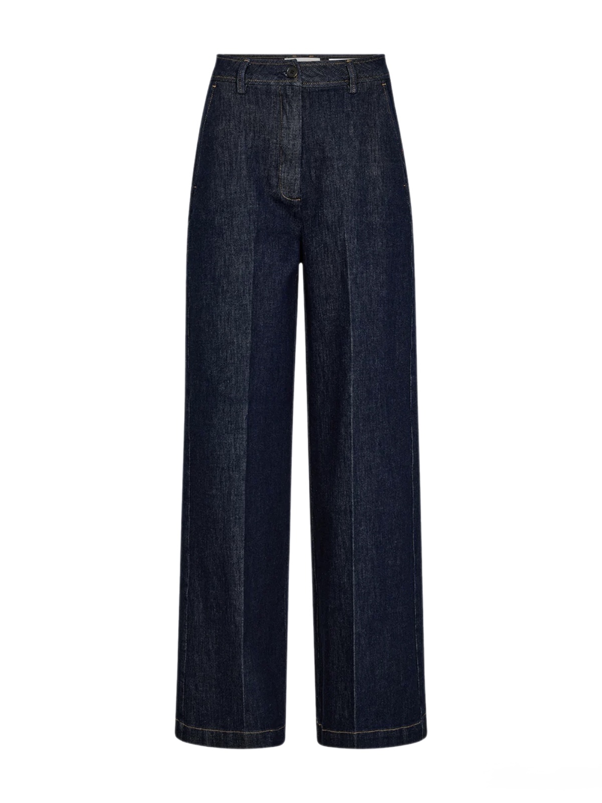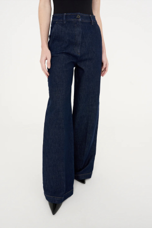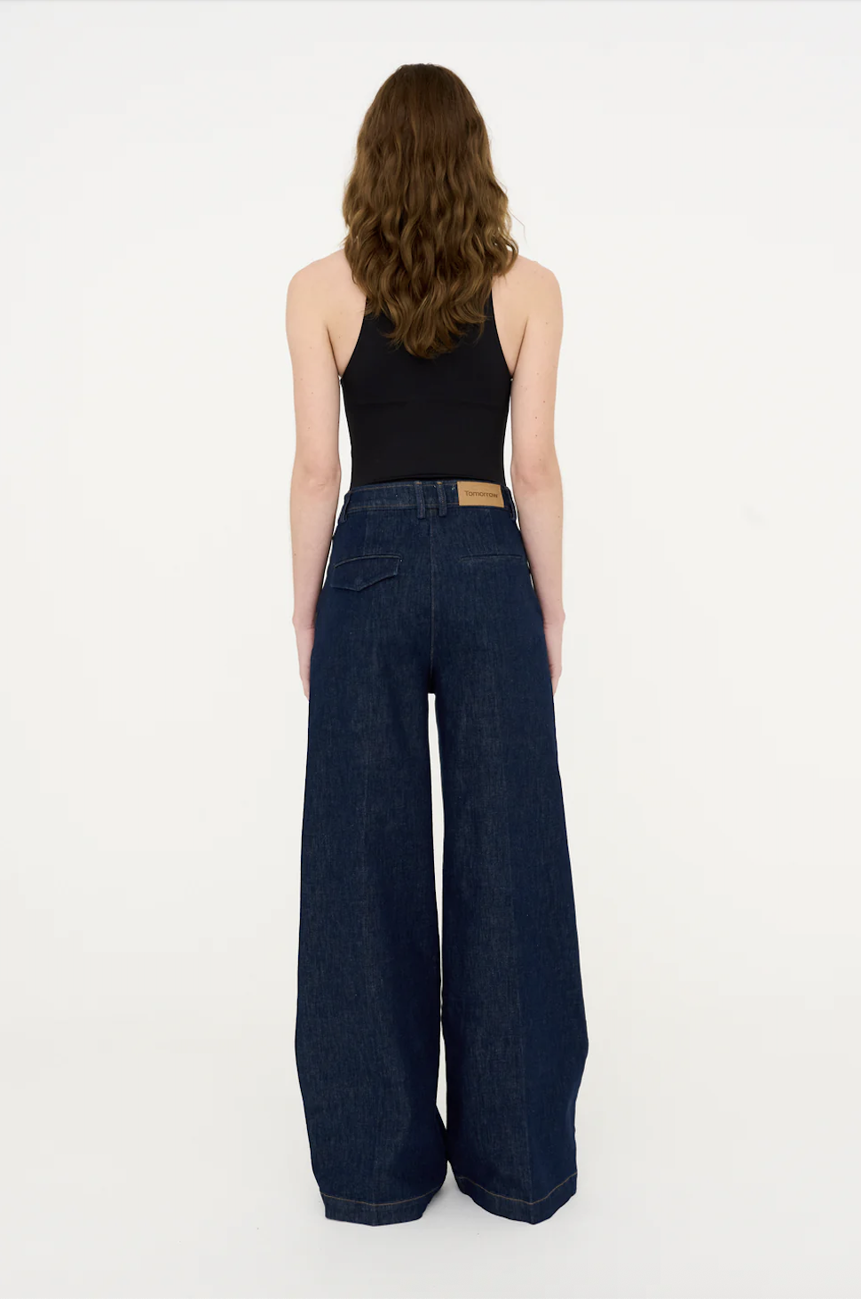 Evelyn French Wash Jeans fra Tomorrow er et par skreddersydde jeans med vide ben og høyt liv, med pressede folder. Laget i strukturert denim med stretch i en dyp indigovask. Designet med skrå frontlommer og asymmetriske baklommedetaljer for en ren og moderne silhuett. Lengde 32″.