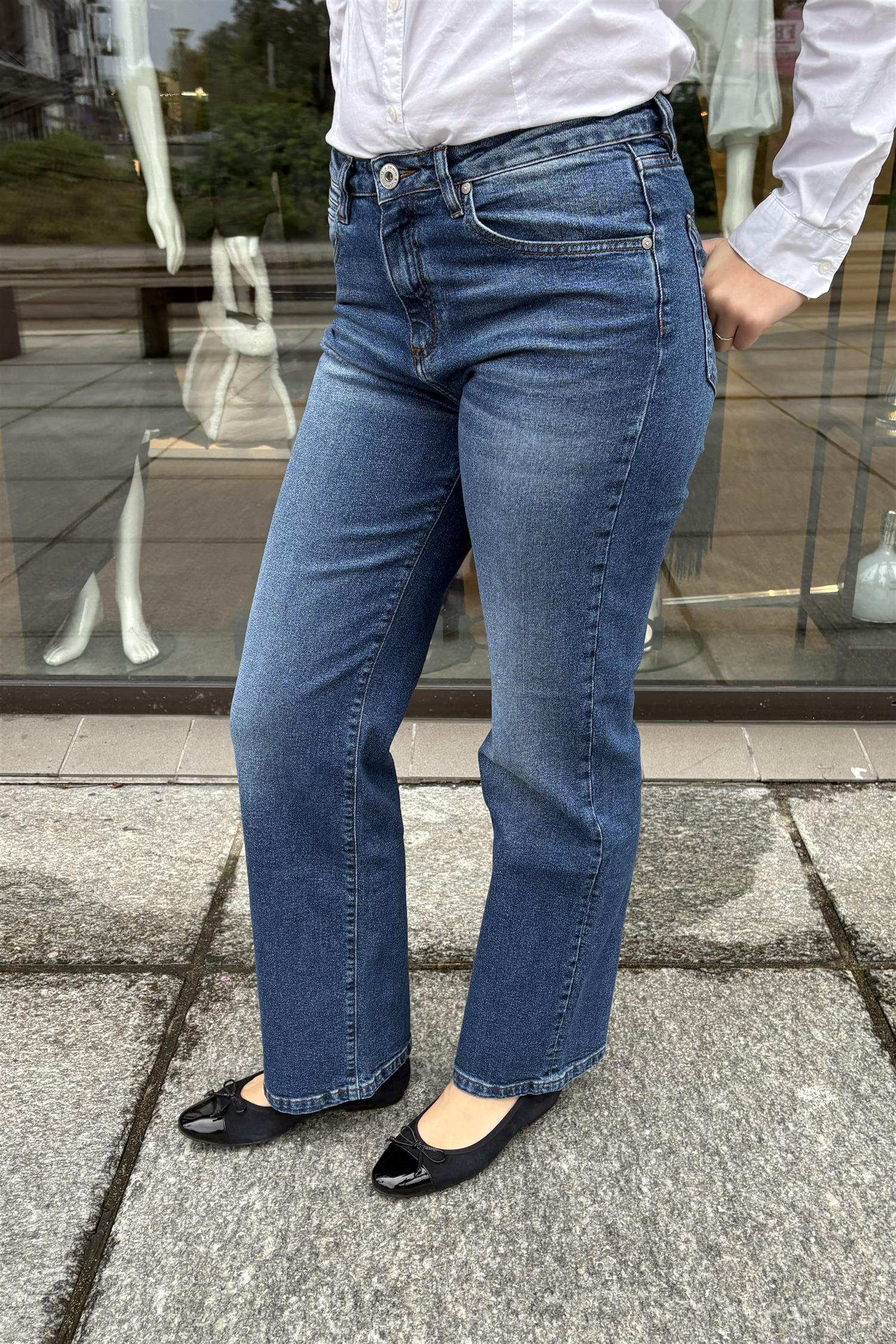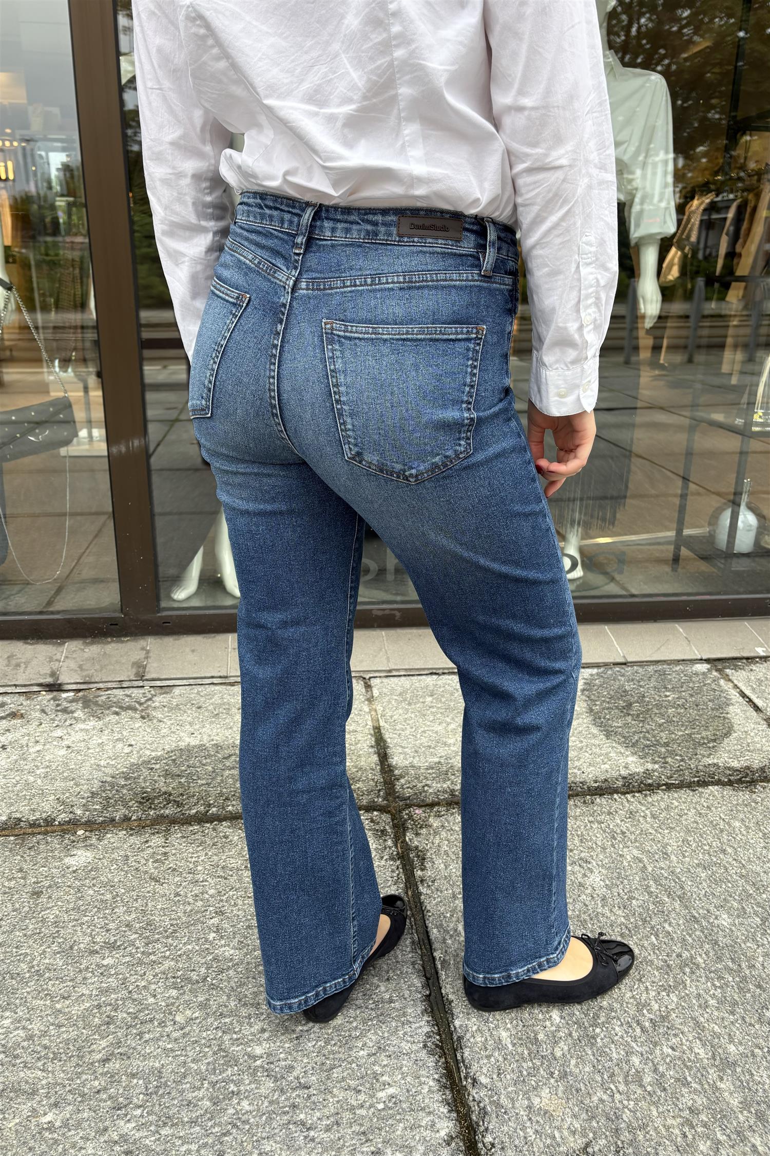 Jim er en bestselger fra Denim Studio. Buksen er høy i midjen og har utsvingte bein med sleng. Lekre detaljer
