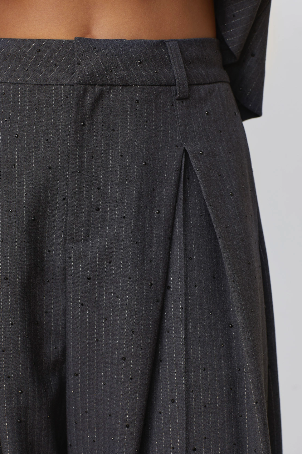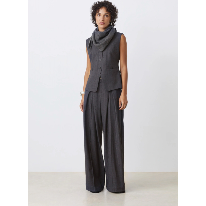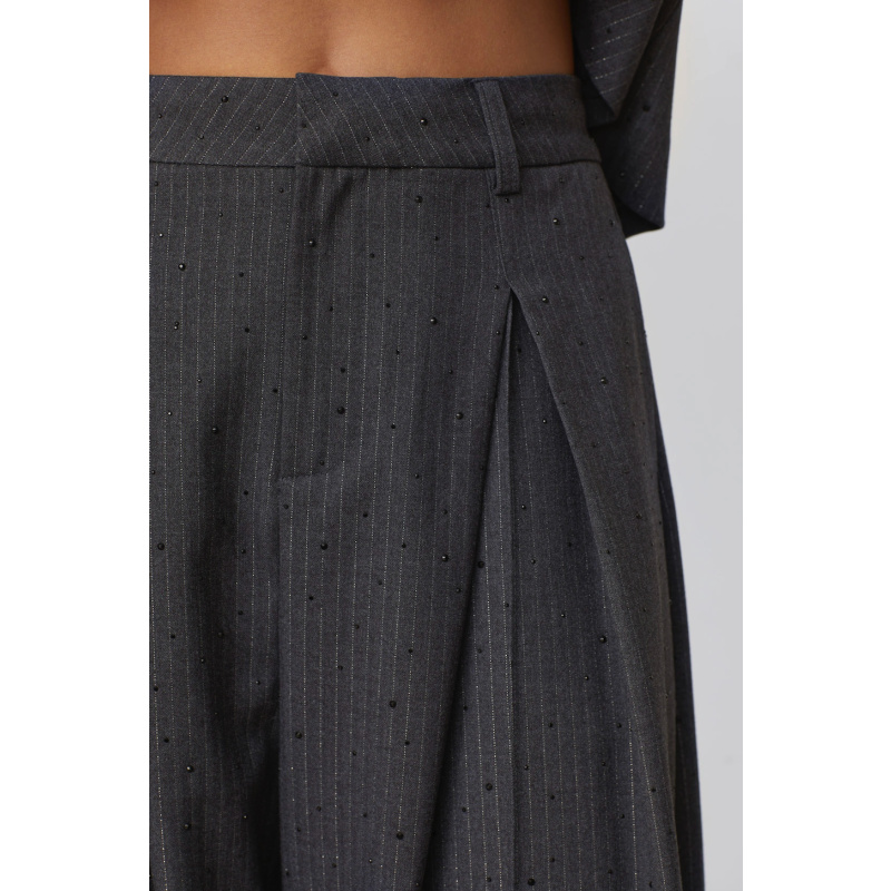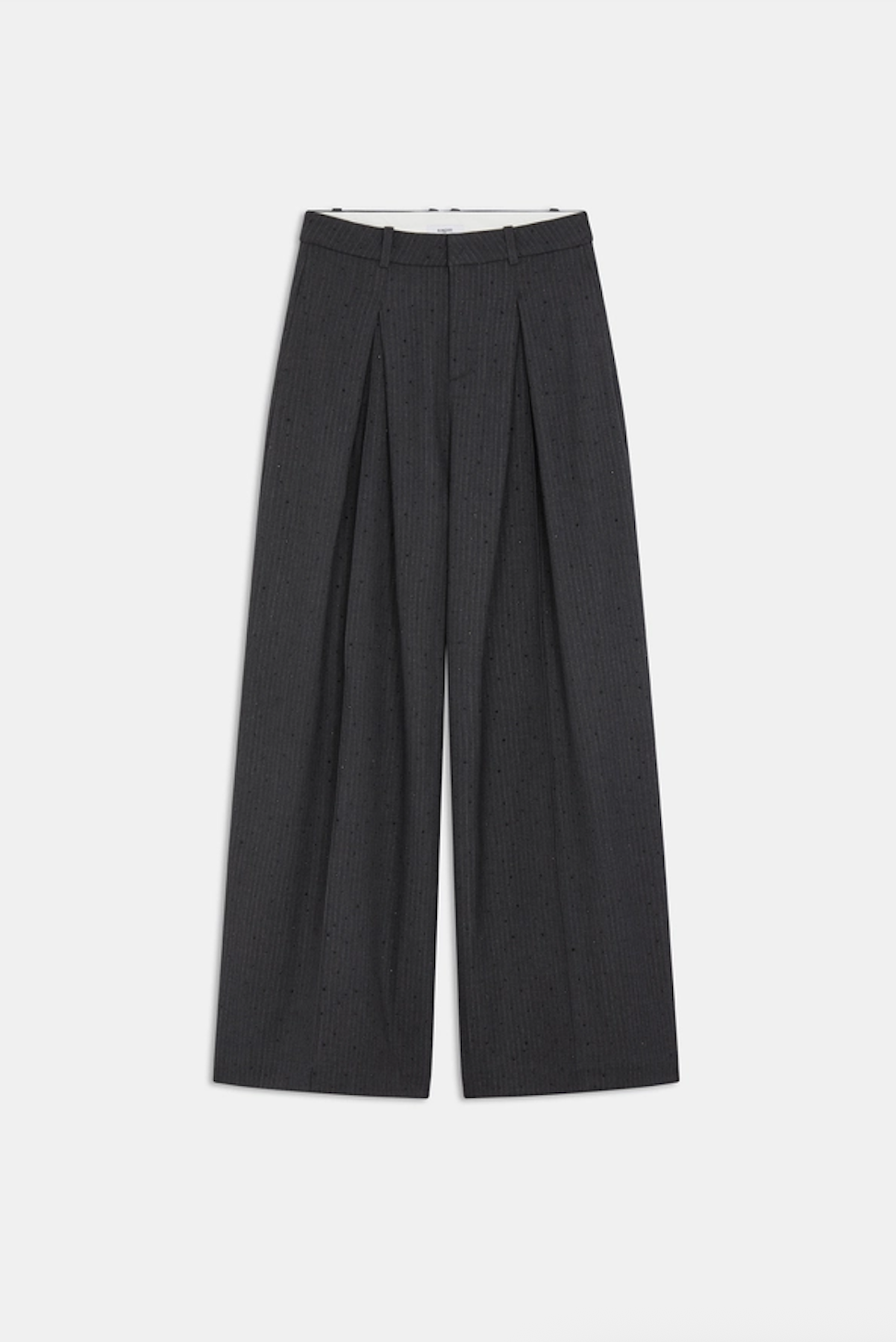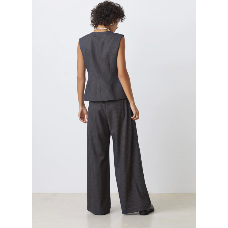 Dressbukse med glitrende rhinestones og pinstripes fra Suncoo. Buksen har vide bein med plisserte detaljer. Elegant og avslappet passform. For en komplett look kan den styles med Derek Vest.