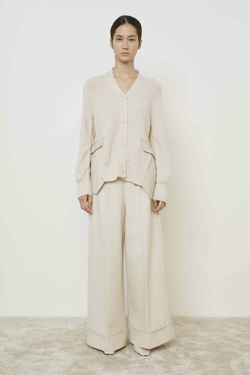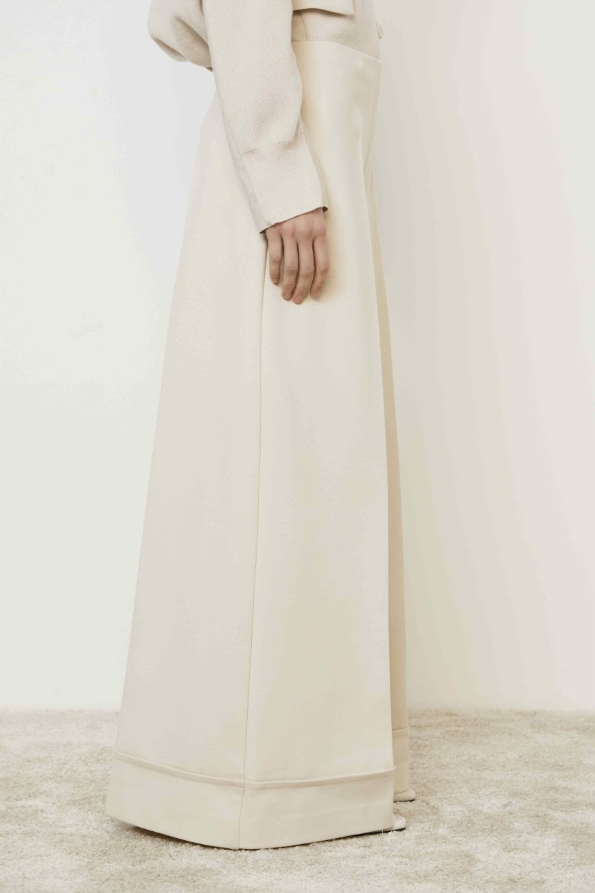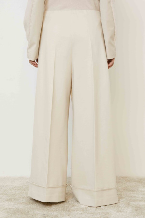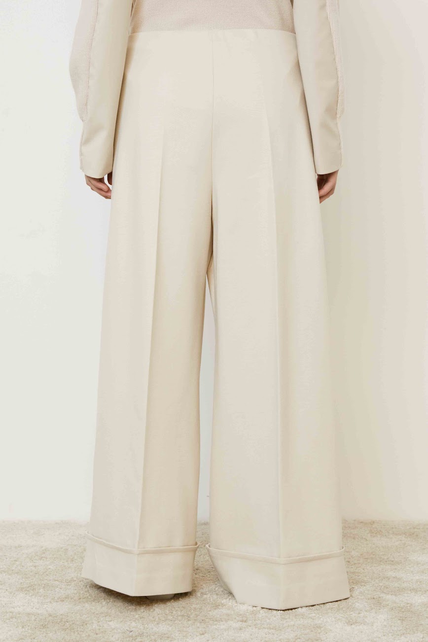 Bukse fra Meimeij med vide lett utsvingte bein. Dekorativ fald nederst på beina. Stretchy stoff med strikk i midjen. Buksen har en høy midje. Den kommer i off-white og sort.