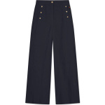 Pim Trousers. Pim Trousers fra Busnel er en wideleg bukse i 100% bomull. Buksen er mid-waist, dekorert med tre gullknapper på hver side på lommene. Passformen er avslappet men elegant, i klassisk Busnel stil. Buksen kommer i en denimblå farge som sklir rett inn i en hver garderobe.