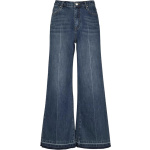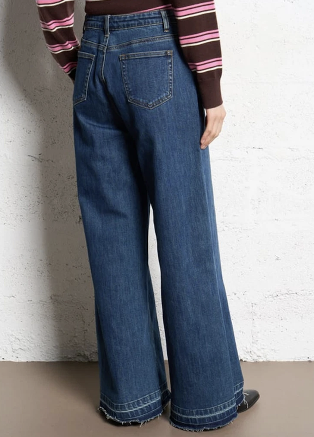 Robb er en vid jeans fra Suncoo. Buksen kommer i en blå vask med kontrastsømmer og frynser nederst på beina. Den har en vanlig passform og høyt liv.