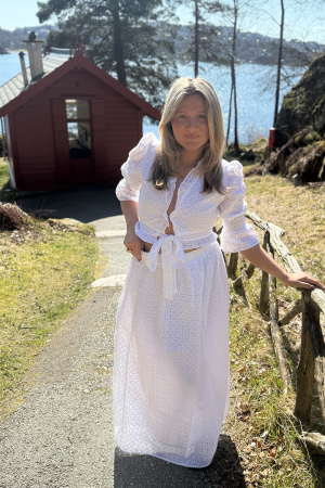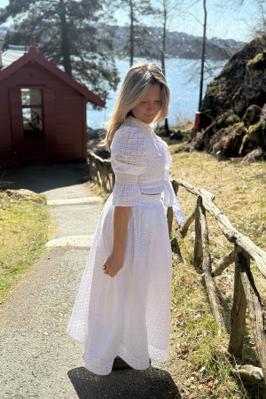 Maxikjole fra Dea Kudibal. Denne kjolen har volumiøse ermer og et utsvingt, lagdelt skjørt. Kan strammes i livet ned et