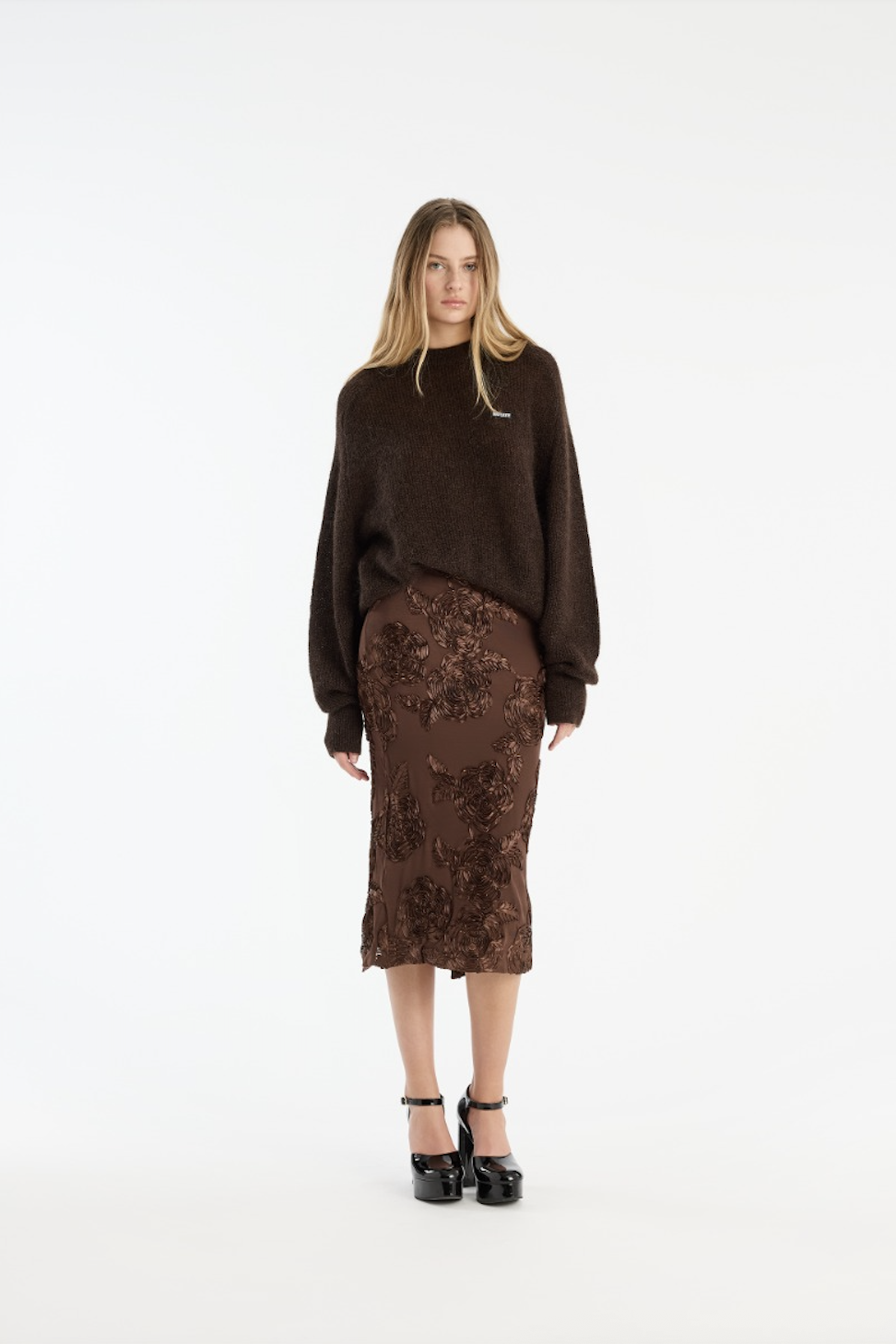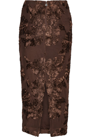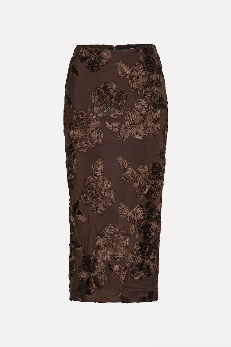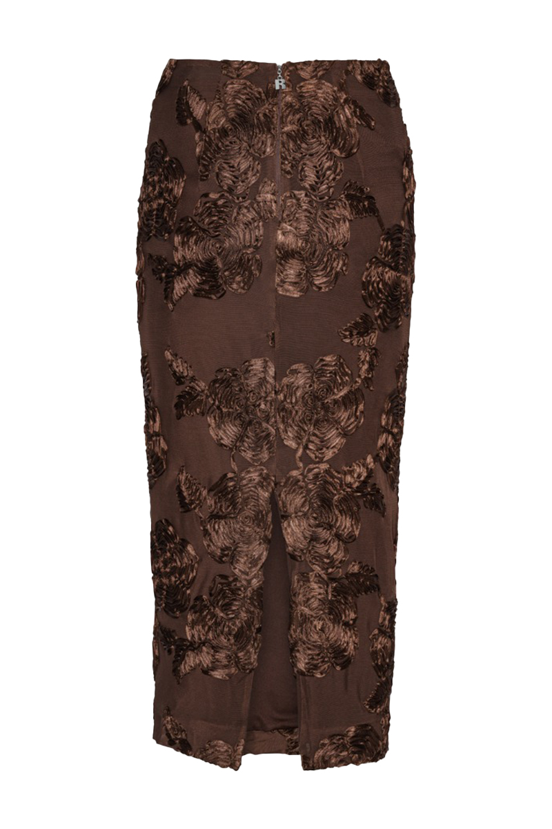 Flower Mesh Pencil Skirt fra Rotate er et figursydd midiskjørt i stretchy mesh med florale applikasjoner i fløyel, som gir både tekstur og dybde. Den smale fasongen fremhever silhuetten, mens splitten bak gjør den behagelig å bevege seg i.
