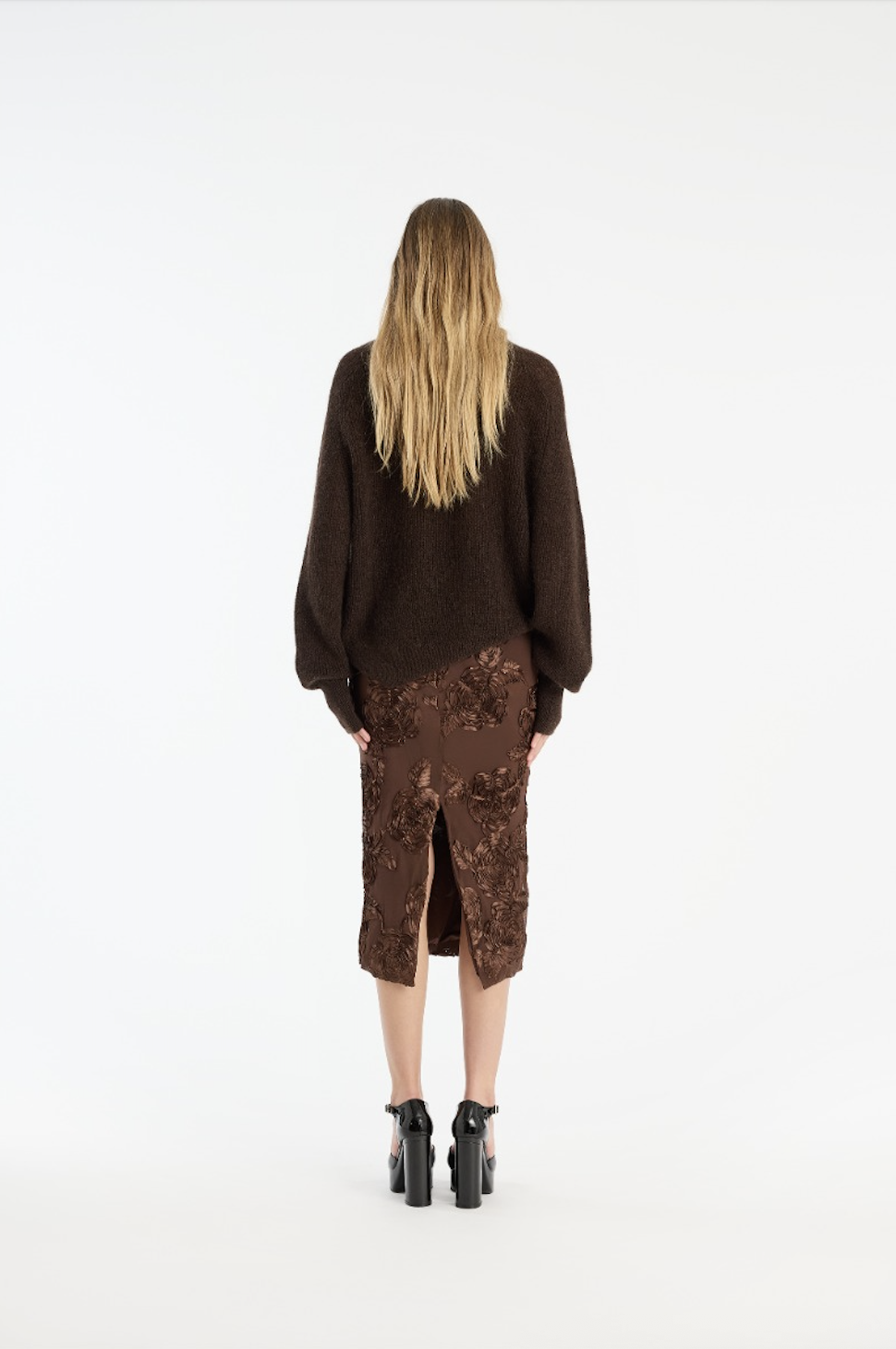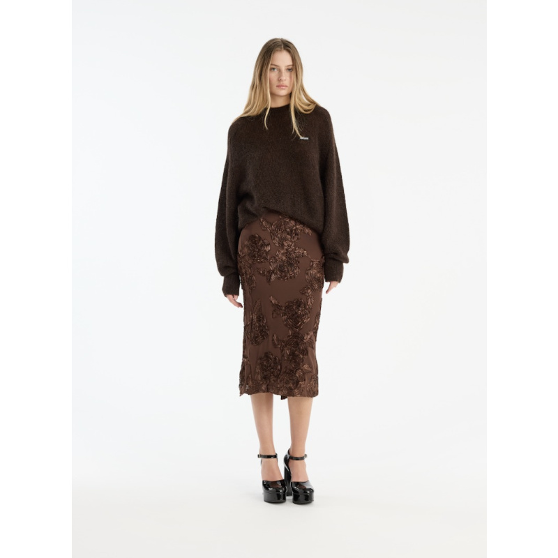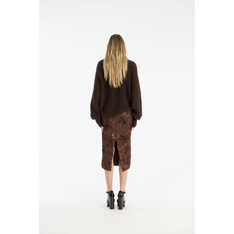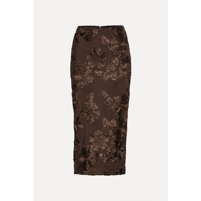 Flower Mesh Pencil Skirt fra Rotate er et figursydd midiskjørt i stretchy mesh med florale applikasjoner i fløyel, som gir både tekstur og dybde. Den smale fasongen fremhever silhuetten, mens splitten bak gjør den behagelig å bevege seg i.