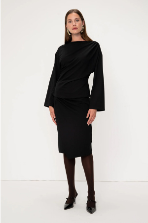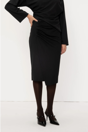 Hadar er et midilengde-skjørt laget i en elastisk viskoseblanding. Den tettsittende silhuetten fremheves av en asymmetrisk fald med elegante draperinger