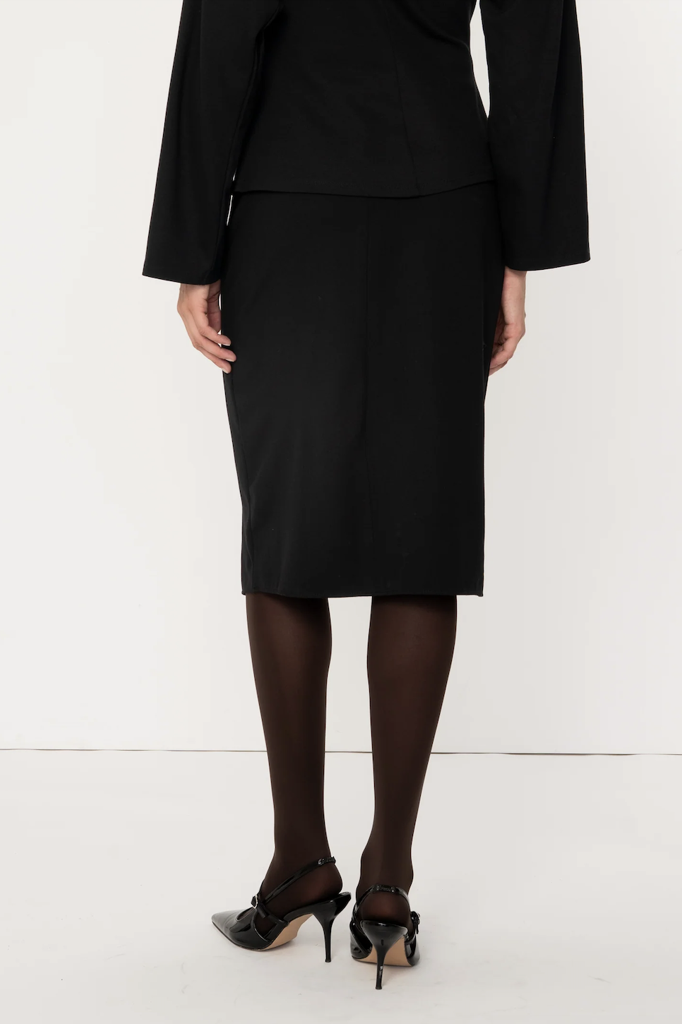 Hadar er et midilengde-skjørt laget i en elastisk viskoseblanding. Den tettsittende silhuetten fremheves av en asymmetrisk fald med elegante draperinger og splitt i siden for bevegelighet. Skjørtet har elastisk linning.