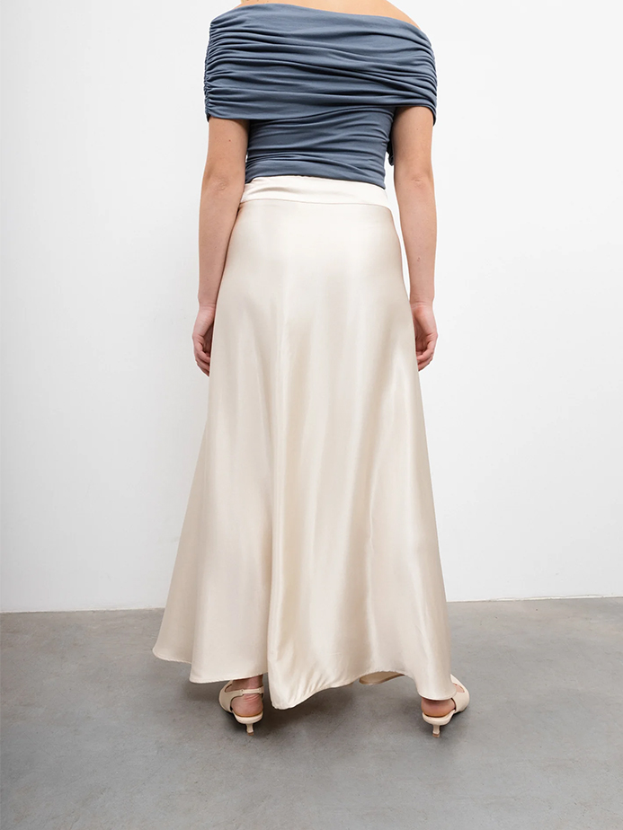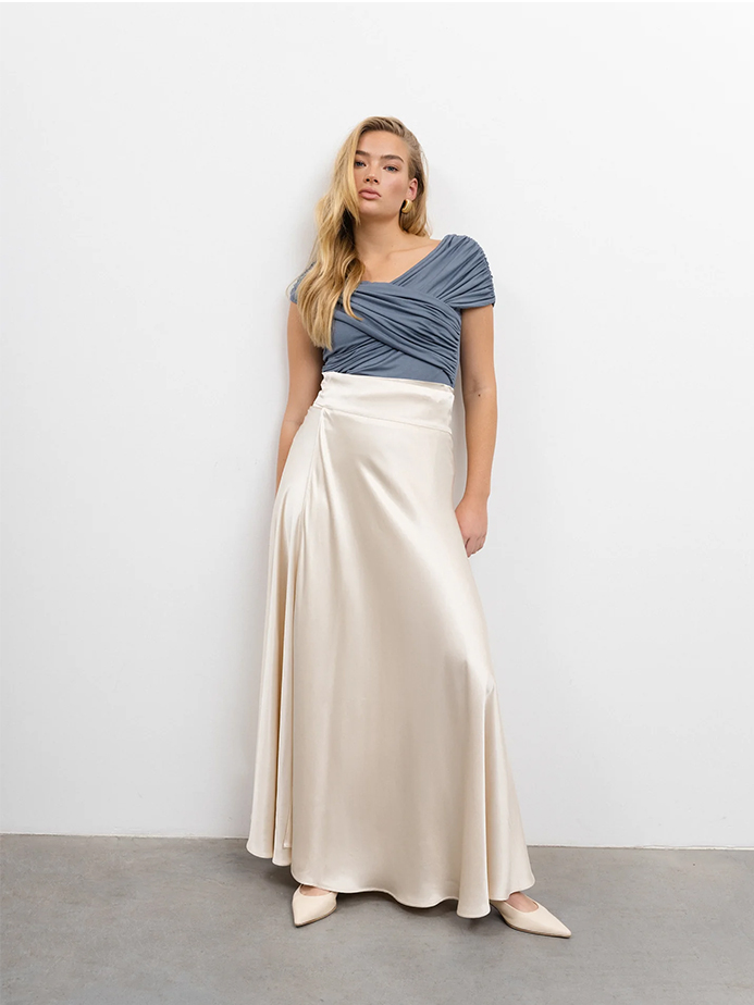 VIVEH Hazel-omslagskjørtet er tilbake i en vakker, ny Champagne-farge. Hazel er et omslagskjørt i maxi-lengdemed en flytende silhuett. Det er laget av en elegant rayon- og viskose-sateng, som føles myk og behagelig mot huden.