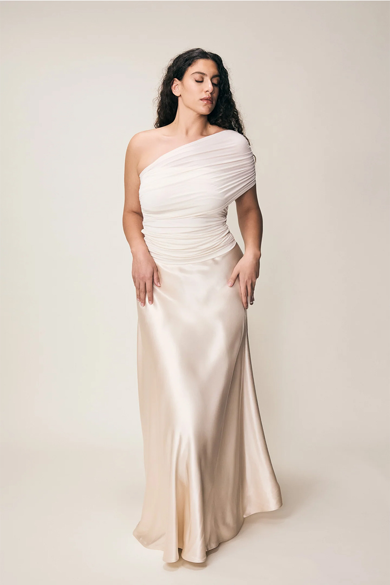 VIVEH Giada har et rynket, off-the-skulder snitt som skaper en vakker omslag over brystet, noe som gjør den til den