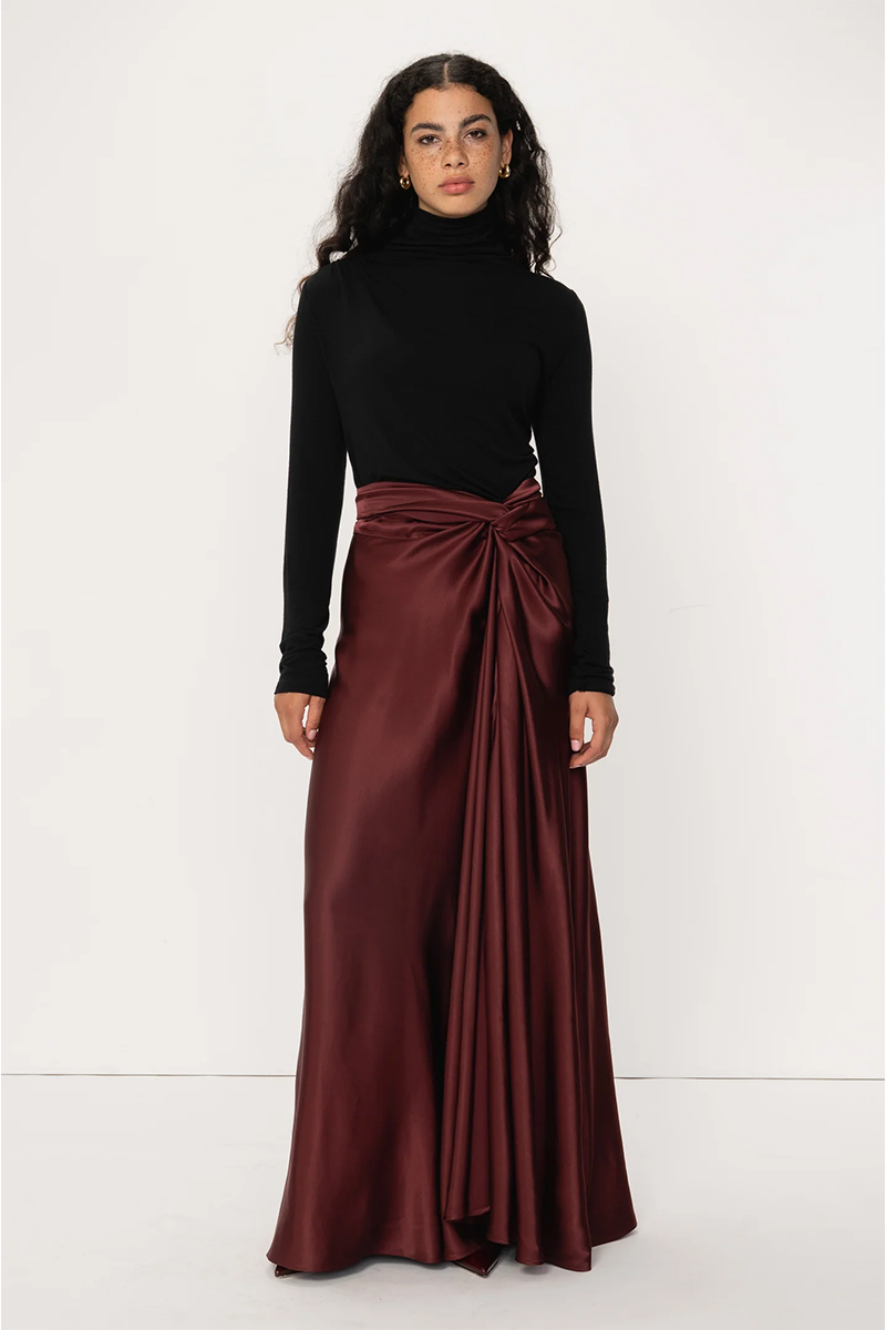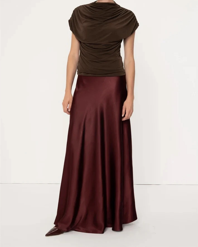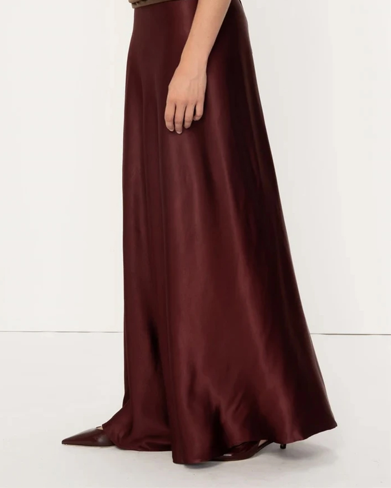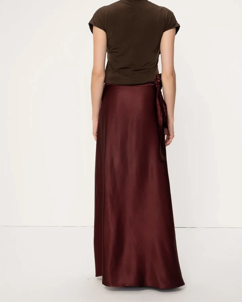 Hazel fra Viveh er et omslagsskjørt i maxilengde med en flytende, elegant silhuett. Skjørtet er laget i en rayon- og viskosesateng med god tyngde.