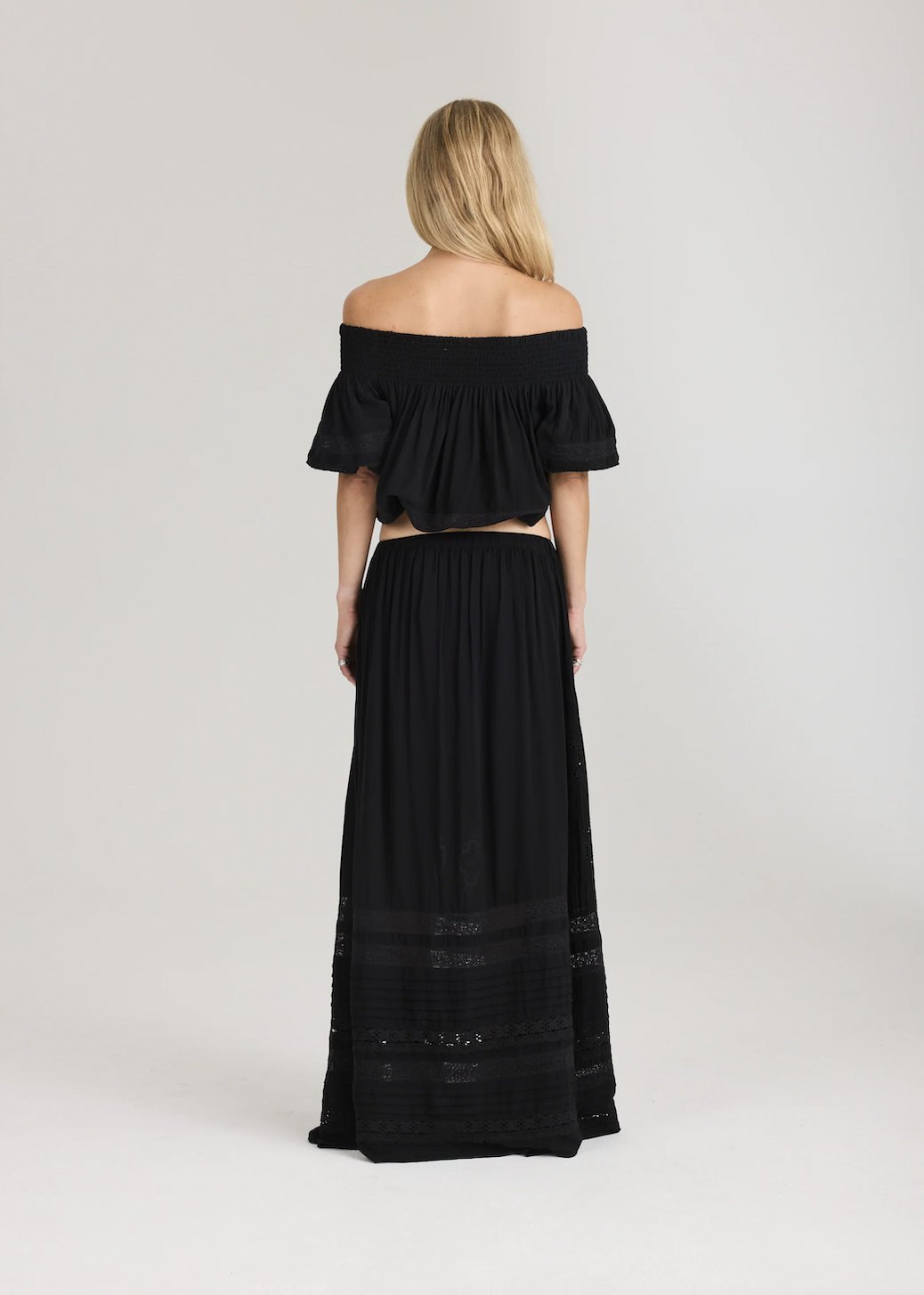 Lita Maxi Skirt. Lita Maxi Skirt fra Ravn Ravn er et maxiskjørtet med en flytende silhuett, feminine detaljer og et lett fall. Designet for å gi et avslappet, bohemsk uttrykk, enten stylet med den matchende toppen Lita Off-Shoulder Top eller andre enkle sommerfavoritter.