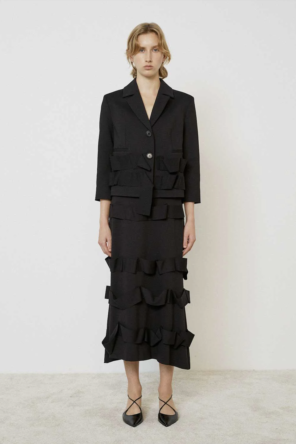 Dion Skirt. Dion Skirt fra Ravn Ravn er et maxiskjørt i chiffon. Asymetrisk design med volangdetaljer nedover skjørtet skaper et