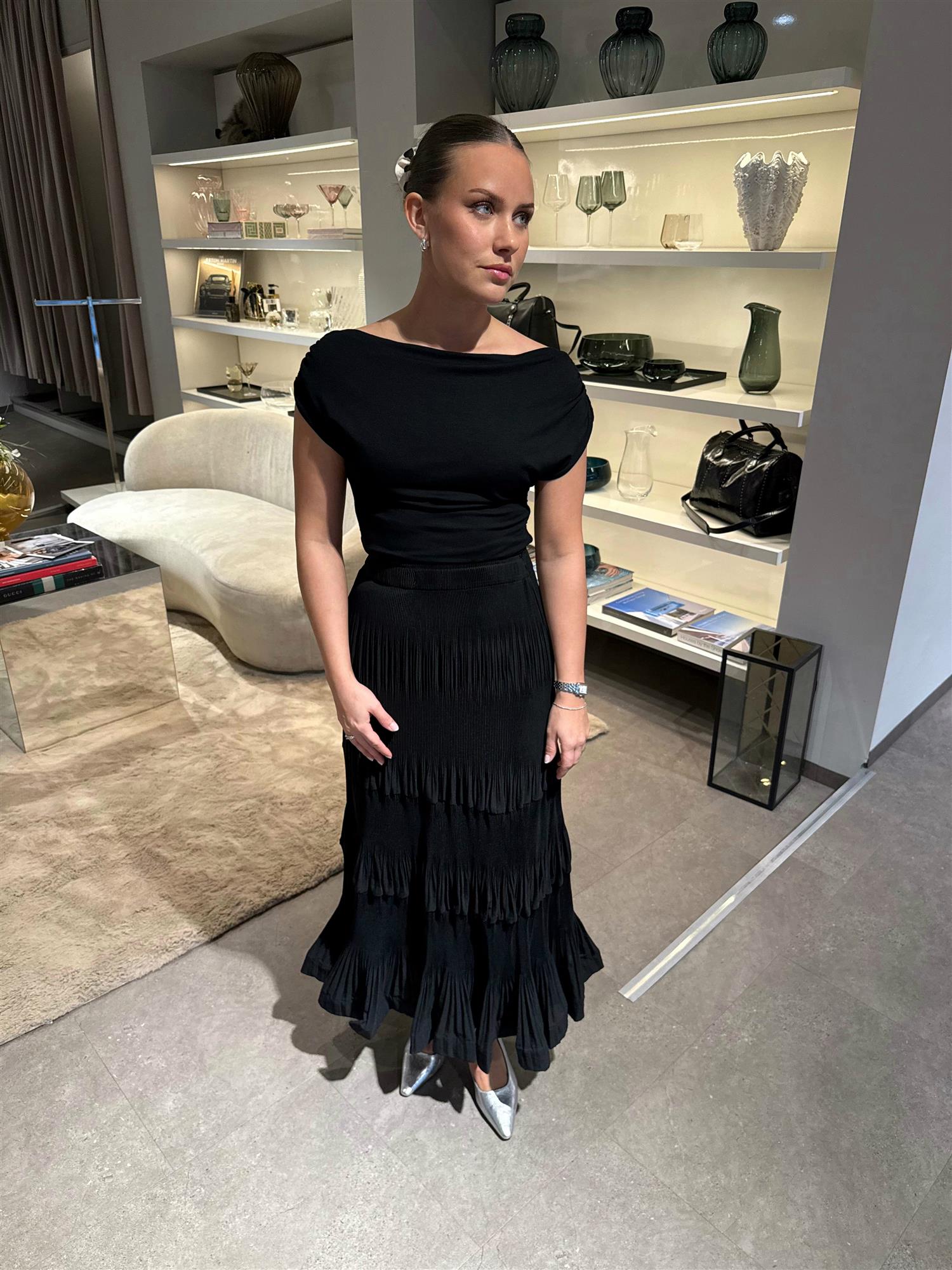 Skjørt fra italienske Meimeij. Skjørtet er dekorert med volangdetaljer som strekker seg nedover hele skjørtet og kommer i et super elastisk materiale. Strikk i midjen.