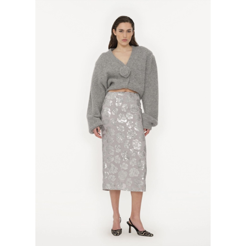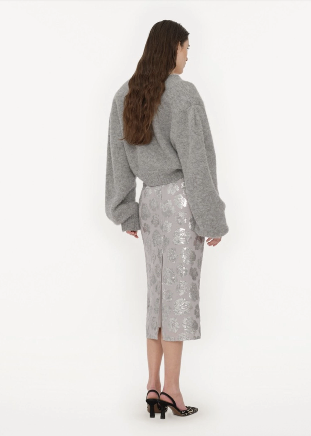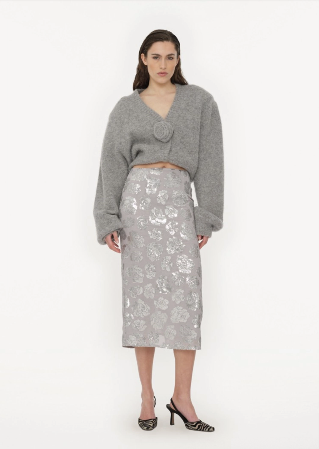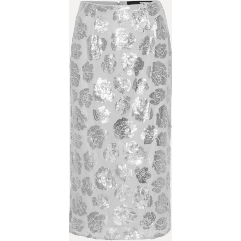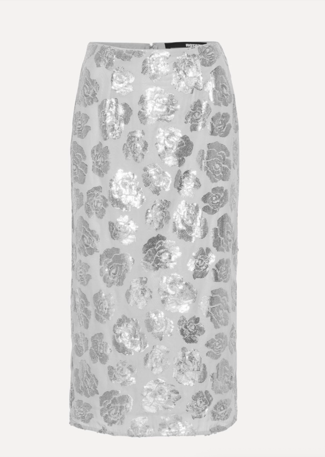 Sequin Chiffon Skirt fra Rotate er et figursydd midiskjørt med paljettdetaljer i sølv. Skjørtet har en høy midje med skjult hektelukking og glidelås, samt en elegant splitt bak.