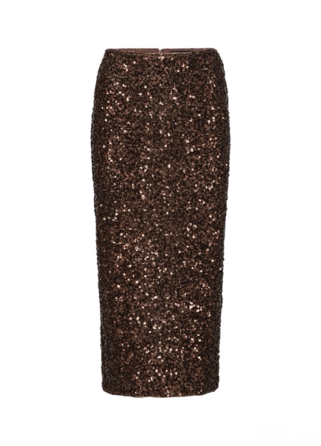 Sequin Pencil Skirt fra Rotate. Sequin Pencil Skirt er et figurnært, midi-langt skjørt pyntet med skimrende paljetter. Det har en rett silhuett, splitt bak og skjult glidelåslukking bak. Skjørtet er fôret.