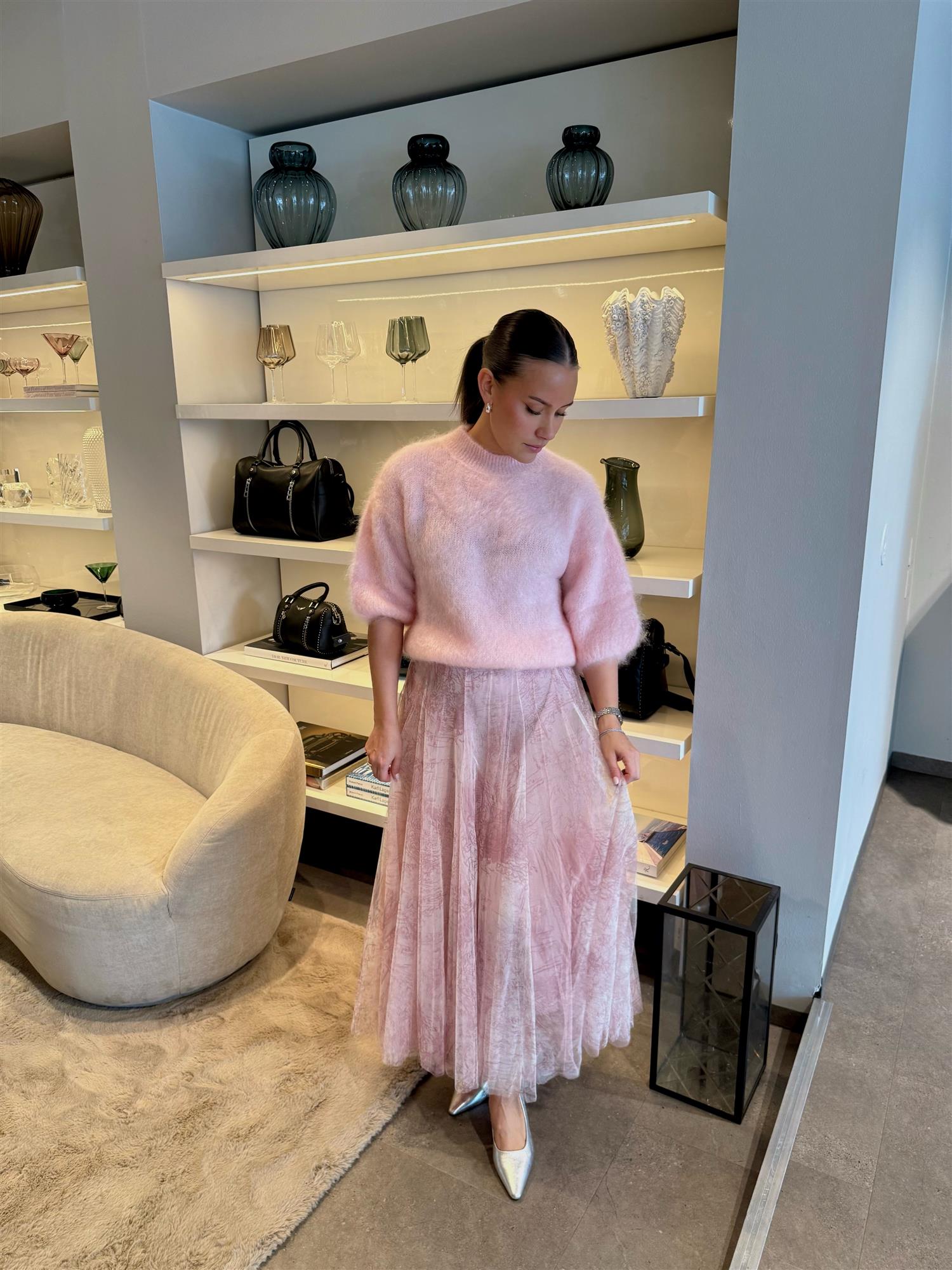 Sequin Chiffon Skirt fra Rotate er et figursydd midiskjørt med paljettdetaljer i sølv. Skjørtet har en høy midje med skjult