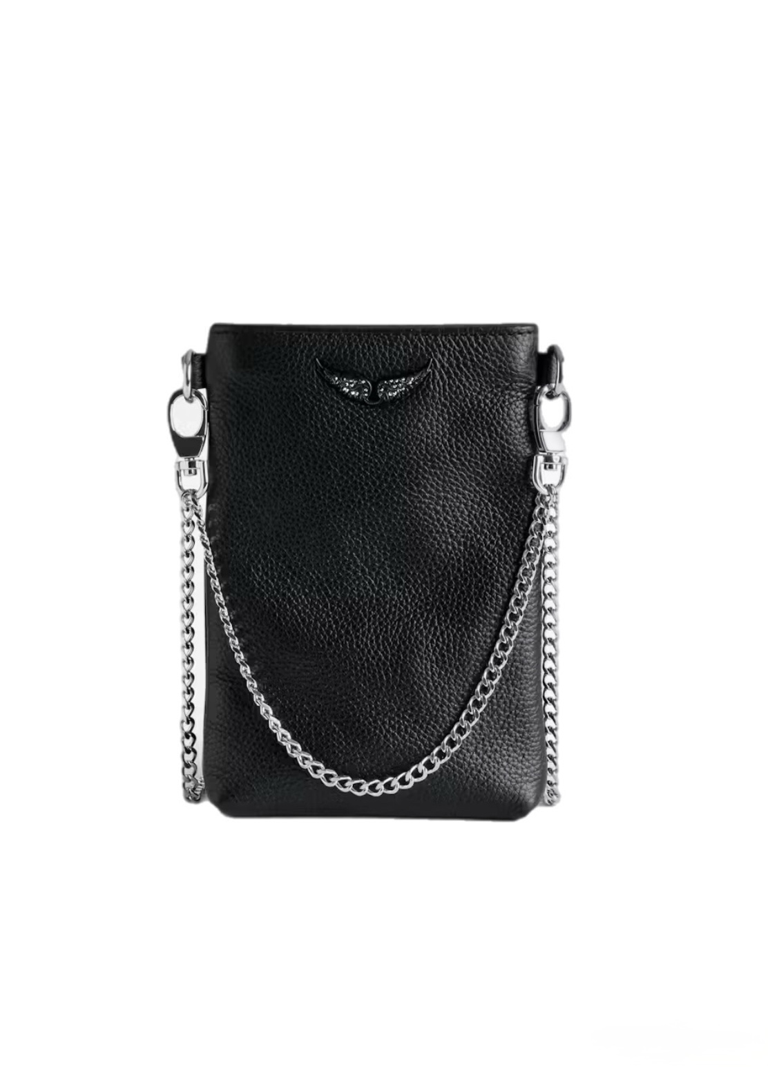 Rock Phone Pouch Grained. Rock Phone Pouch Grained fra Zadig & Voltaire er en mobilveske i teksturert skinn. Vesken har en avtakbar skulderstropp i metall. Innvendig er det tre kortlommer, samt finnes det en utvendig lomme med glidelås på baksiden.