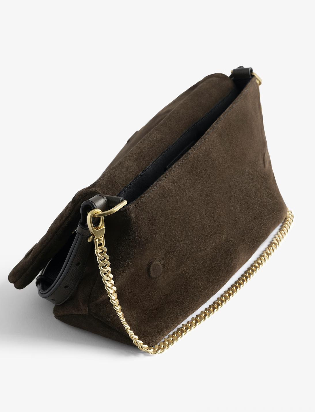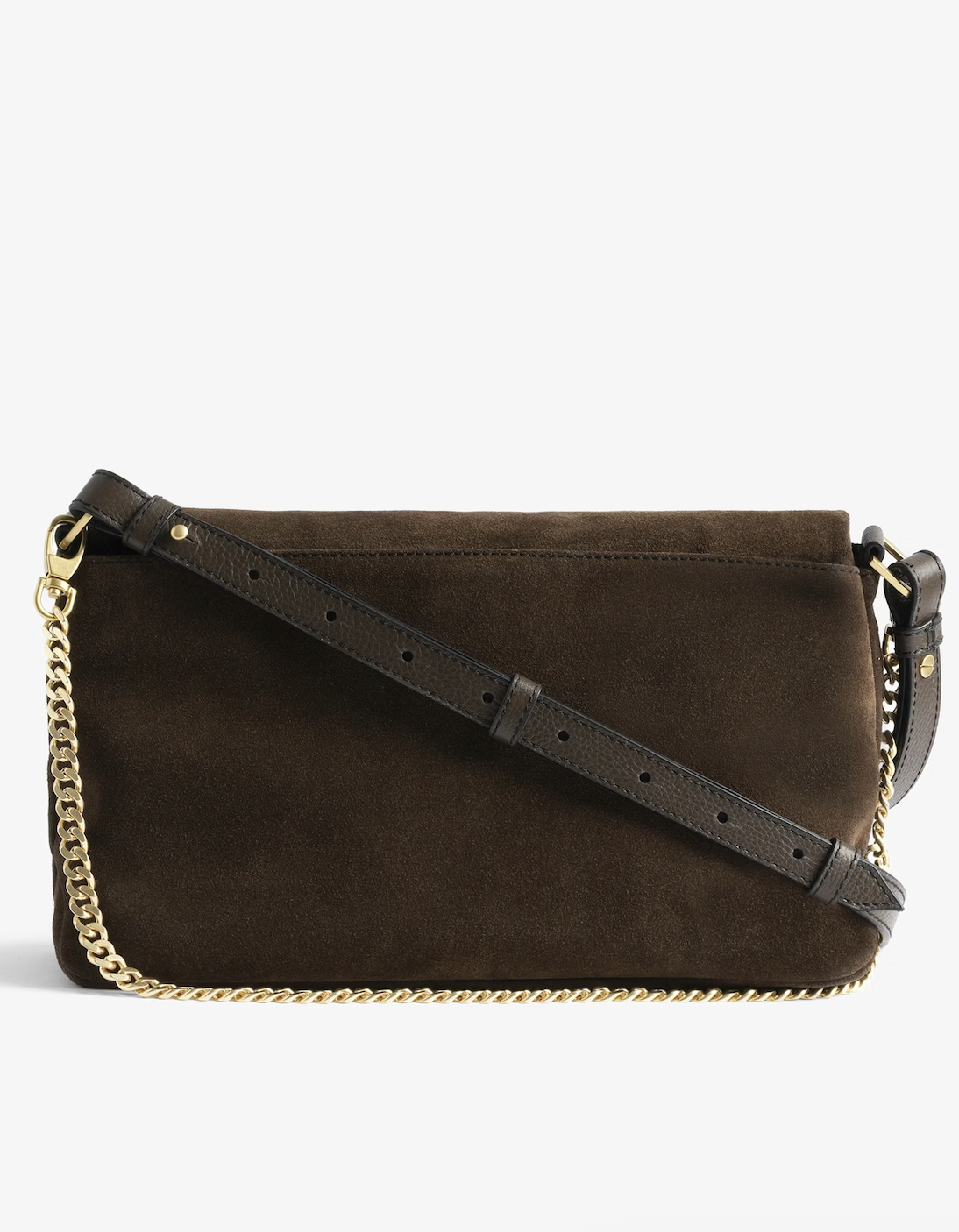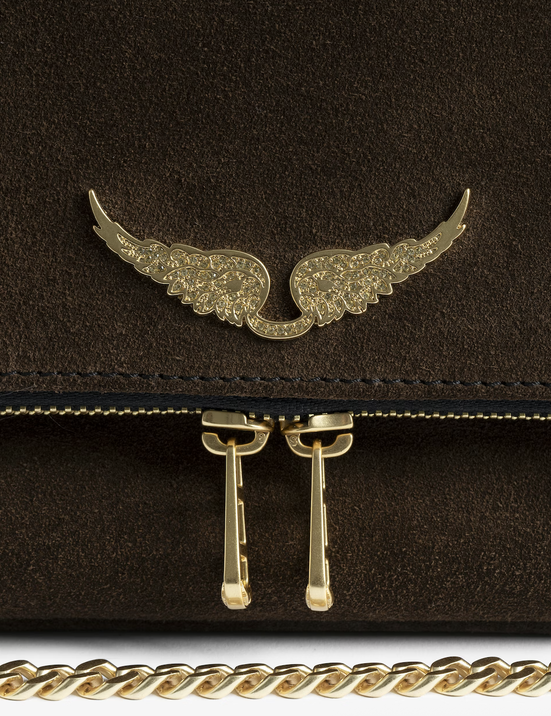 Rocky II Suede. Rocky II Suede fra Zadig & Voltaire er en større versjon av den ikoniske Zadig-vesken Rock. Vesken er har plass til alt du trenger og har magnet- og glidelåslukking. Vesken er dekorert med de ikoniske vingene i glitrende rhinestones og kommer i en nydelig brun semsket skinnkvalitet. Vesken har en liten lomme bak og et hovedrom. Avtakbar chain og justerbar crossbody-stropp i skinn.