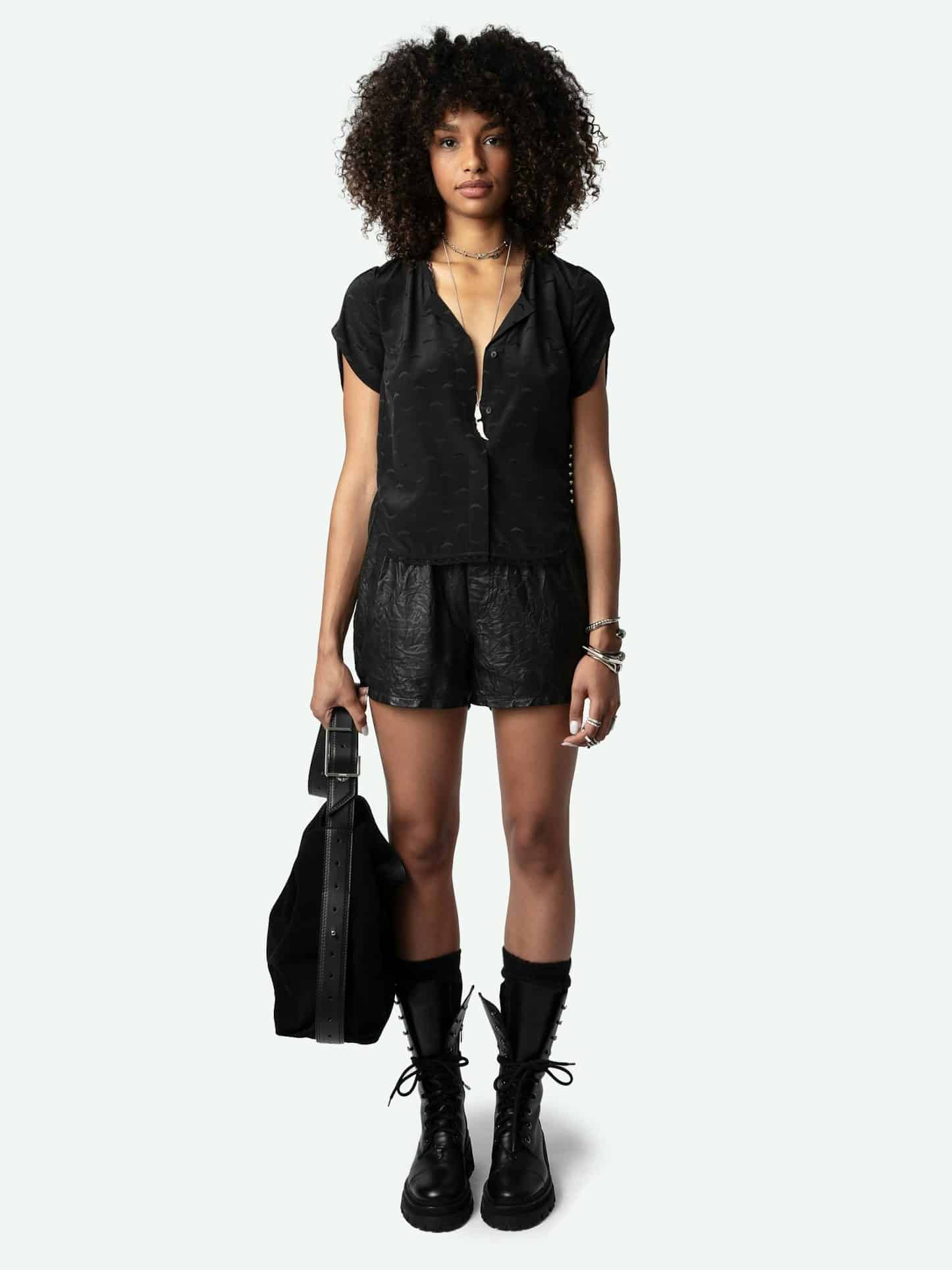 Topp i lingerie- stil i svart silke med jacquardvinger, krage pyntet med blonder og diamantsmykkeknapper til venstre.
