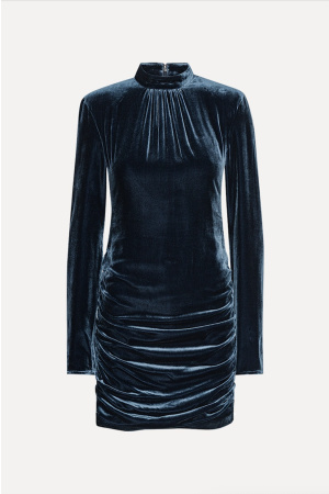 Silk Velvet LS Mini Dress fra Rotate er en elegant minikjole i myk fløyel med lange ermer og høy hals.