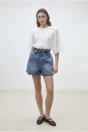 Dara Blouse. Dara Blouse fra Dea Kudibal er en feminin kortermet bluse i bomullspoplin. Blusen har delikate blondedetaljer og korte