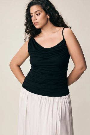 VIVEH Abeba er en tettsittende singlet med spagettistropper og en justerbar “waterfall”-utringning for allsidig styling som kan bæres høyt eller lavt.