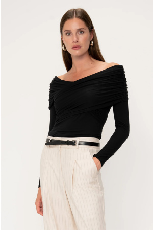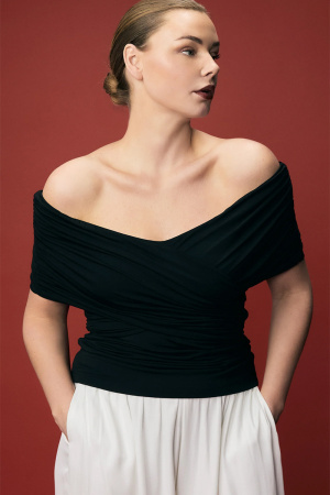 VIVEH Dosinia-toppen har samme passform som vår bestselger Giada, men er laget i et mykere og mer elastisk stoff. Den rynkesydde, off-shoulder-utformingen skaper en