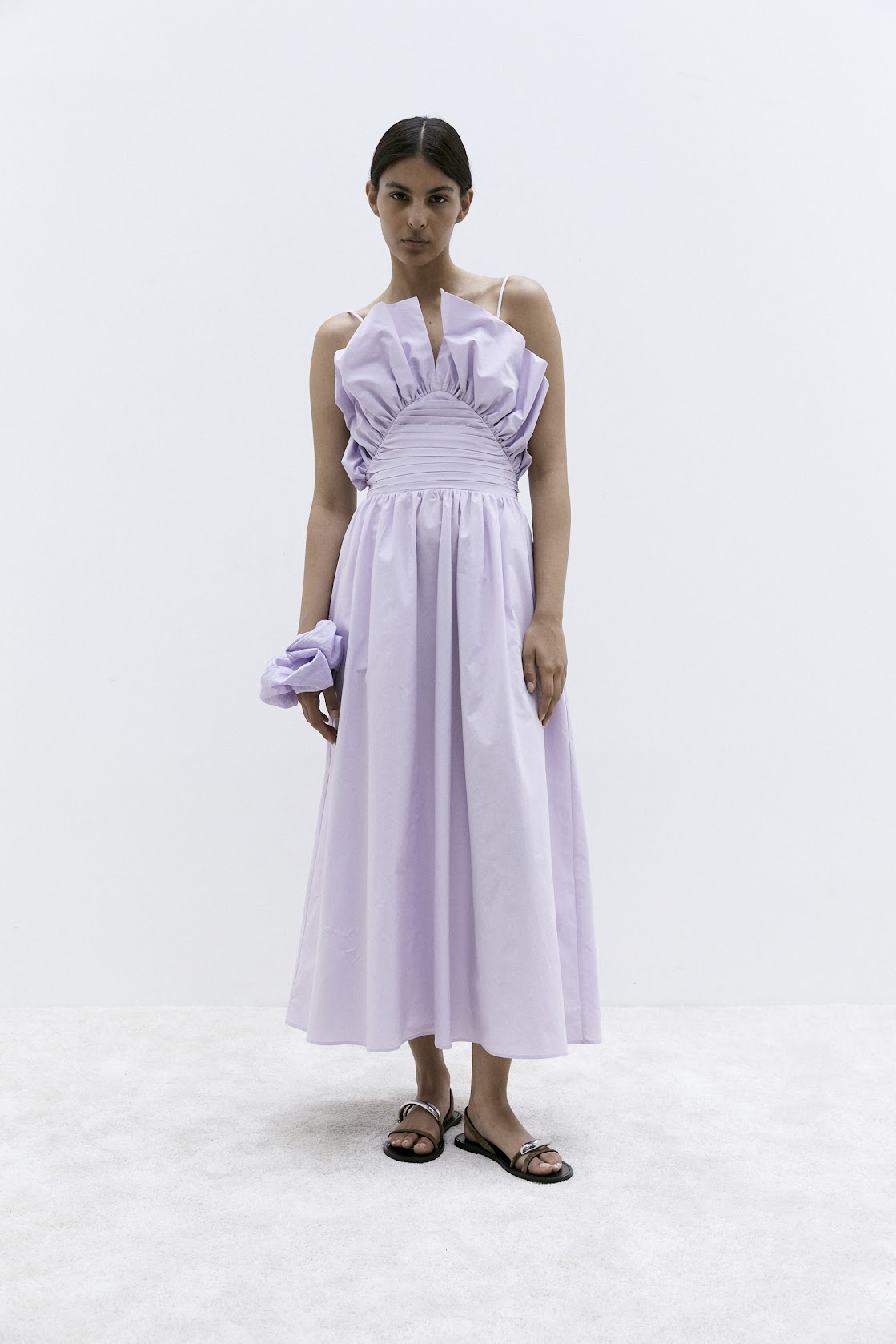 Talia Dress fra Viveh er en ermeløs midikjole i myk og flytende jersey med drapering foran som former halsen og