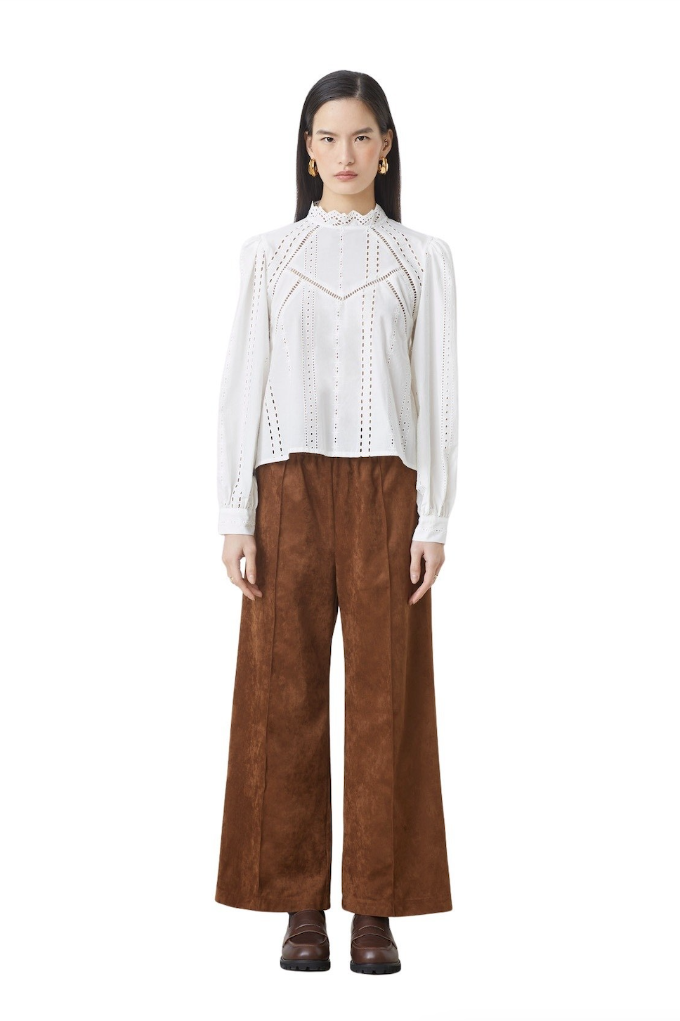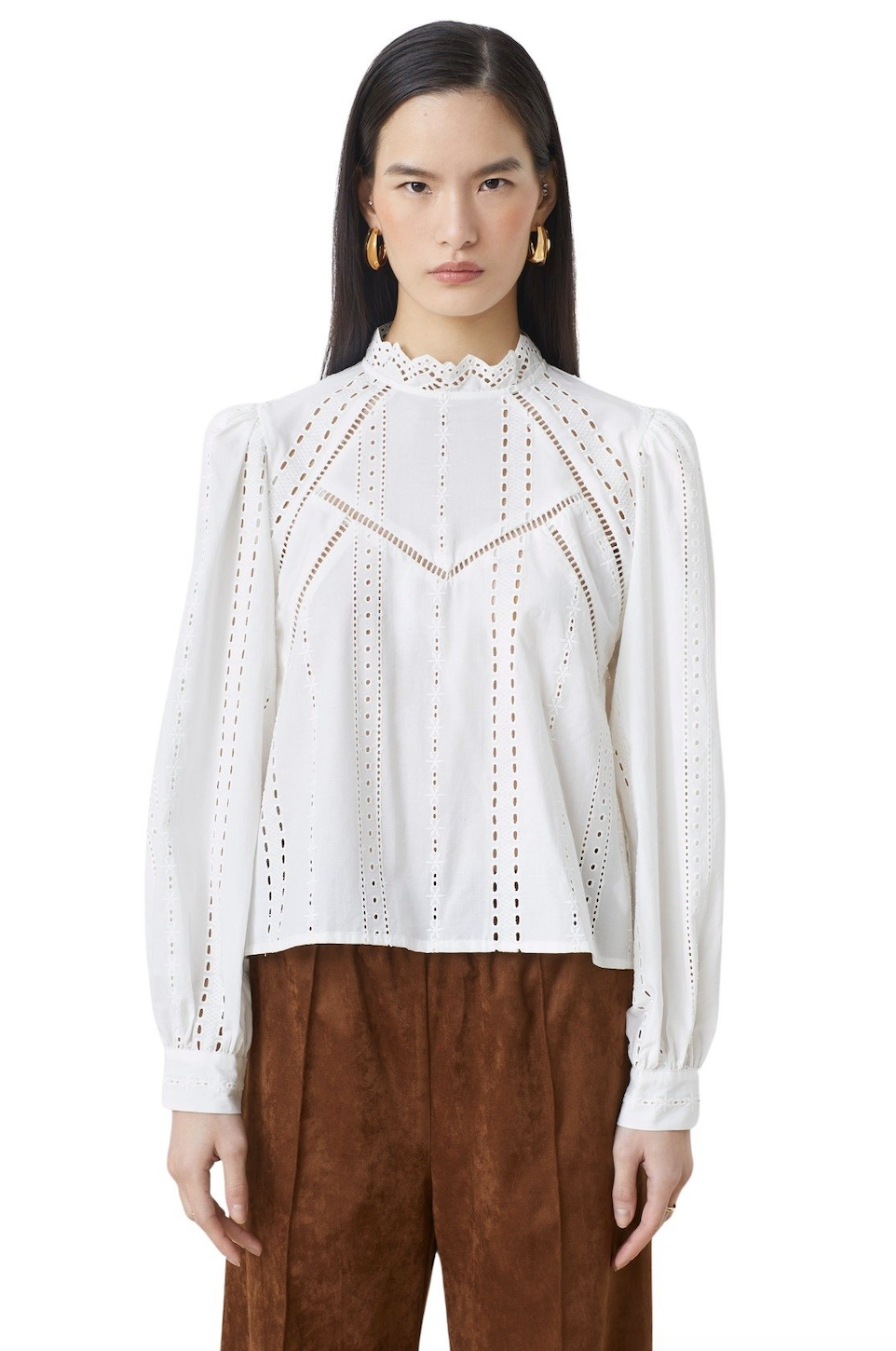 Lais er en bluse i økologisk bomull med romatiske detaljer i engelsk blonde fra Suncoo. Blusen har høy hals med