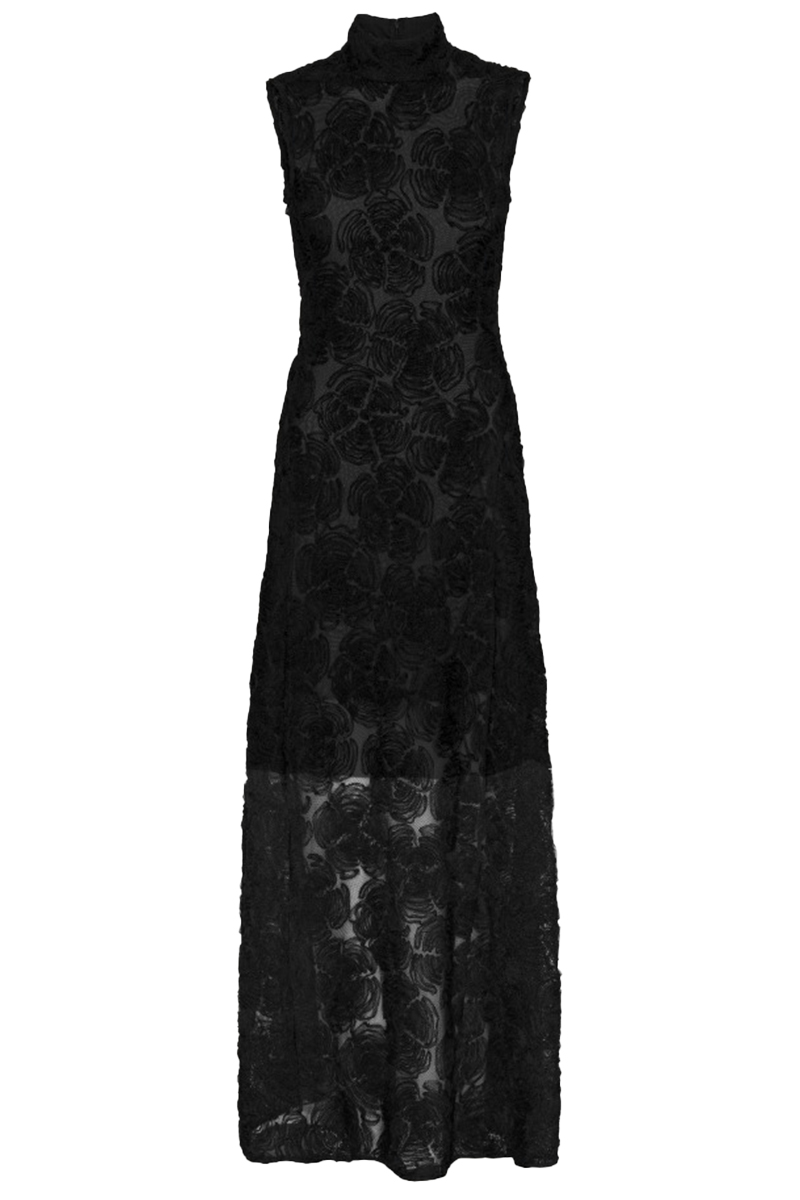 Flower Mesh Maxi Dress fra Rotate er en maxikjole i burgunderfarget mesh, dekorert med ton-i-ton blomsterapplikasjoner som gir en luksuriøs
