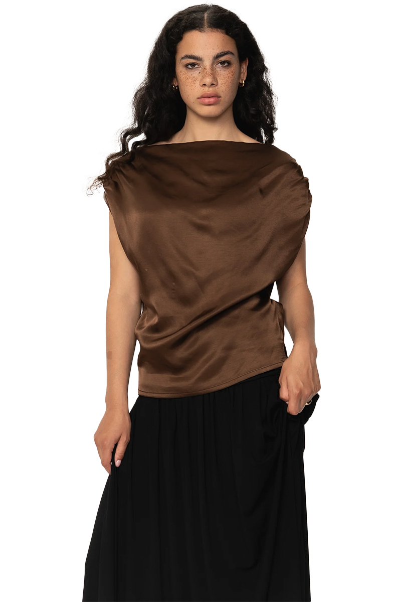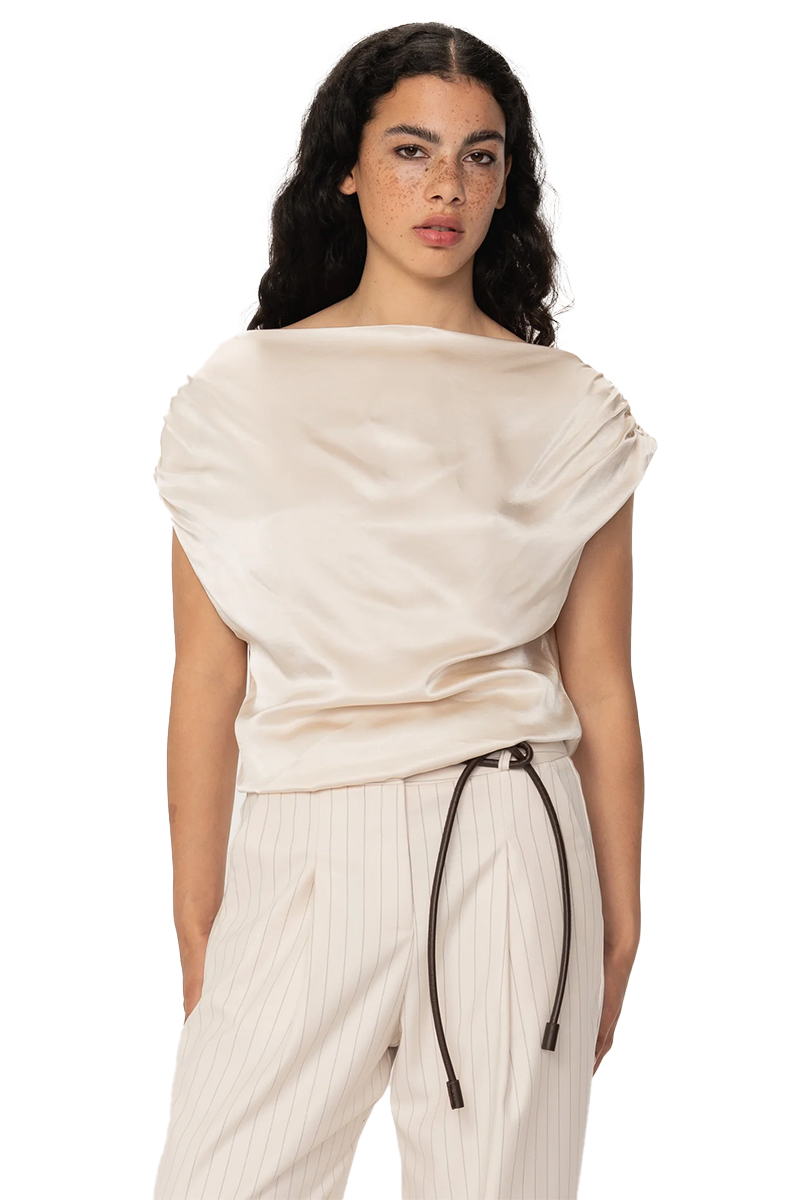 Adhara er en avslappet topp laget i en delikat rayon-viskoseblanding. Toppen har vid hals og rynkede skuldersømmer som skaper myke