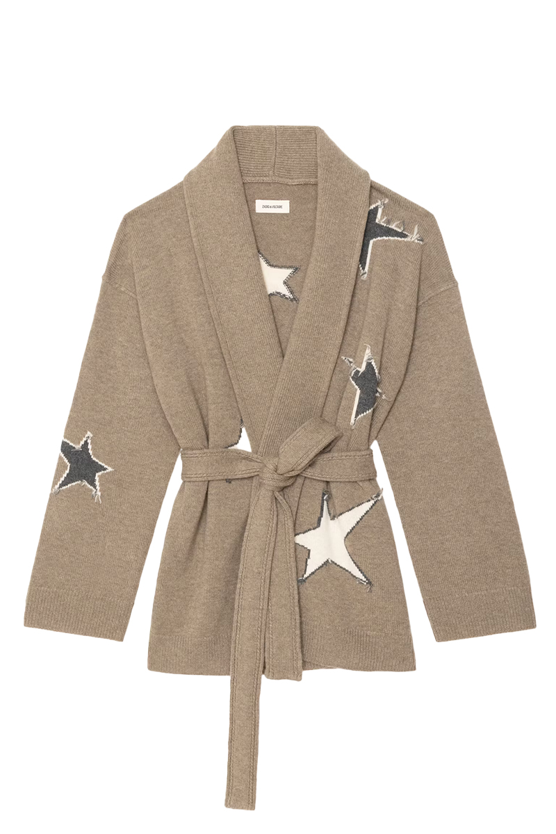 Alpa Coat. Alpa Coat fra Zadig & Voltaire er en mellomlang cardigan-kåpe i 100 % kasjmir med intarsia-strikket stjernemønster. Jakken