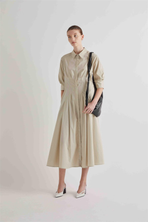 M6PB00 Dress fra Meimeij er en skjortekjole med korte ermer og skjortekrage. Kjolen har foldedetaljer og en markert midje. Stikklommer