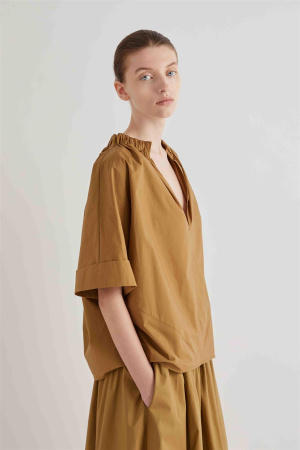 M6PA07 Blouse fra Meimeij er en oversized kortermet bluse. Blusen har en vid passform med halvlange ermer. Dyp v-utringning med
