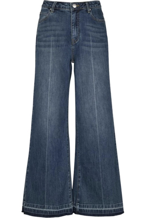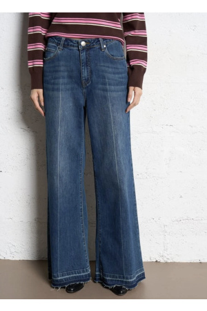 Robb er en vid jeans fra Suncoo. Buksen kommer i en blå vask med kontrastsømmer og frynser nederst på beina.