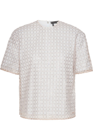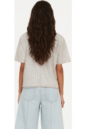 «Beaded Oversized Top» har et intrikat perlemønster og en avslappet, boxy, oversized passform. En skjult glidelås i ryggen gjør den