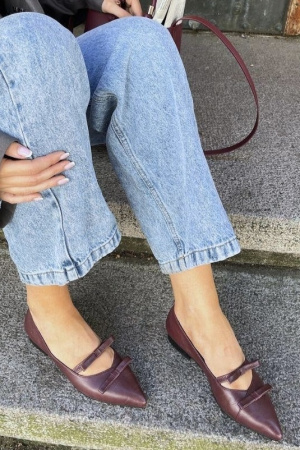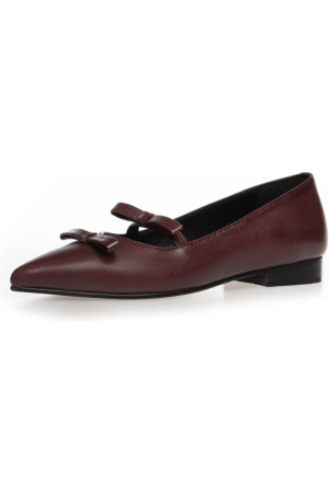 En feminin ballerinasko i bordeaux-skinn fra Copenhagen Shoes. Skoen har en spiss tå og elegante sløyfer over vristen. Designet kombinerer