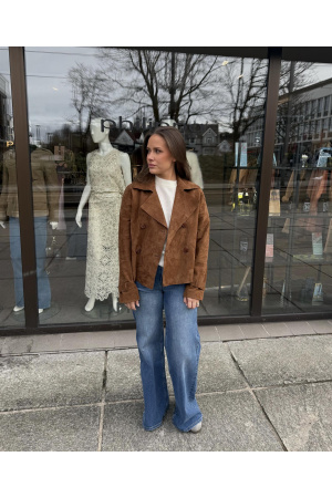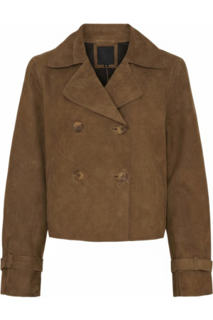 Suede Short Trenchcoat fra Notyz er en kort semsket trenchcoat i en nydelig karamellfarge. Jakken er dobbelspent og har en